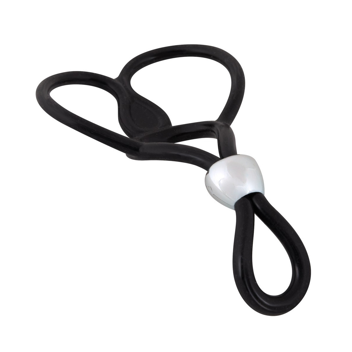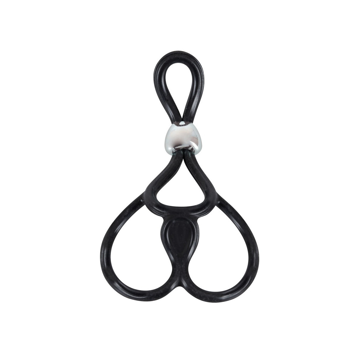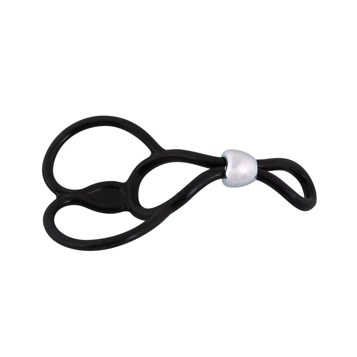 Anello del pene con due anelli per testicoli (Ø circa 3 cm ciascuno, estensibile). Anello per il pene regolabile individualmente tramite perlina scorrevole. Lunghezza totale circa 13 cm. Nero. Silicone, ABS.