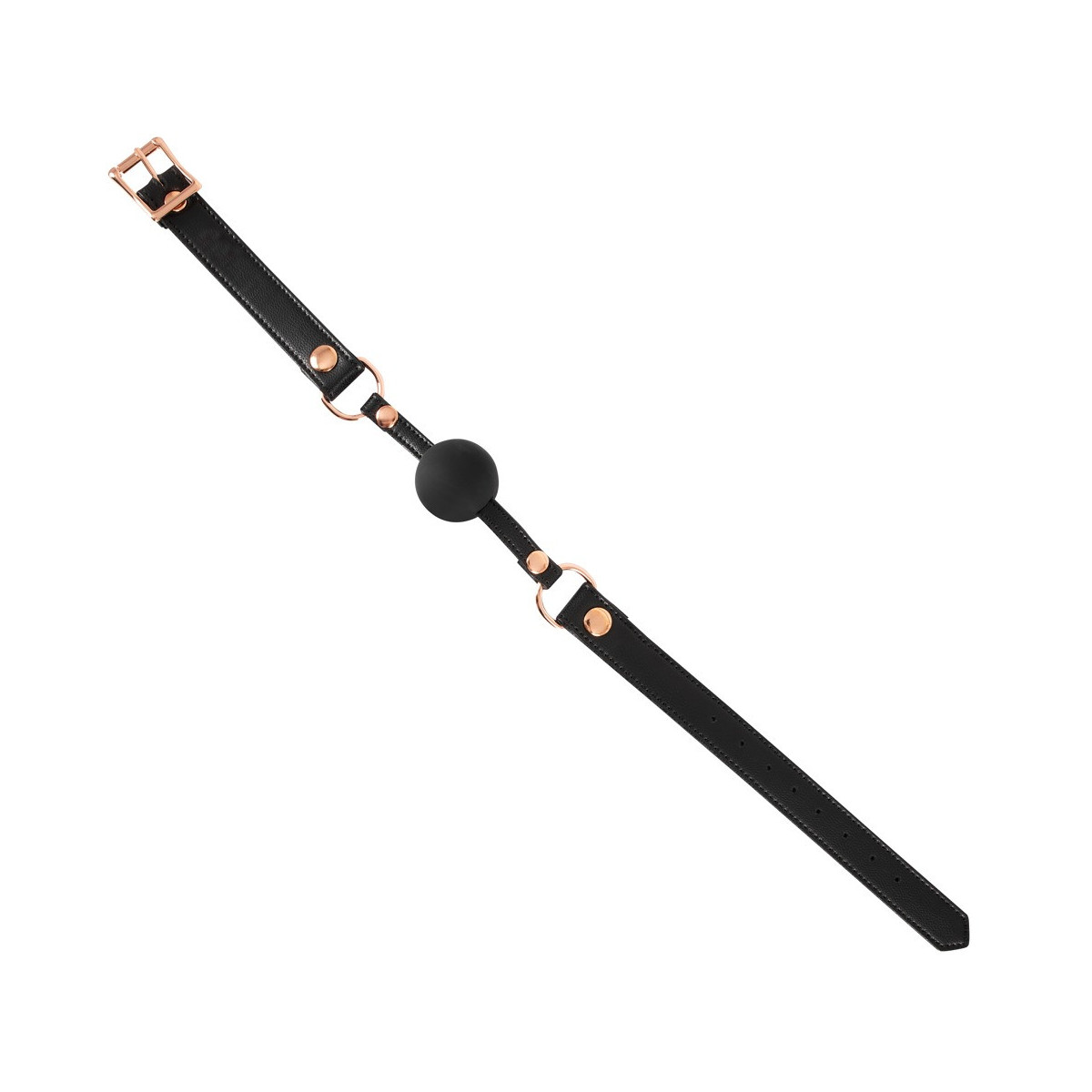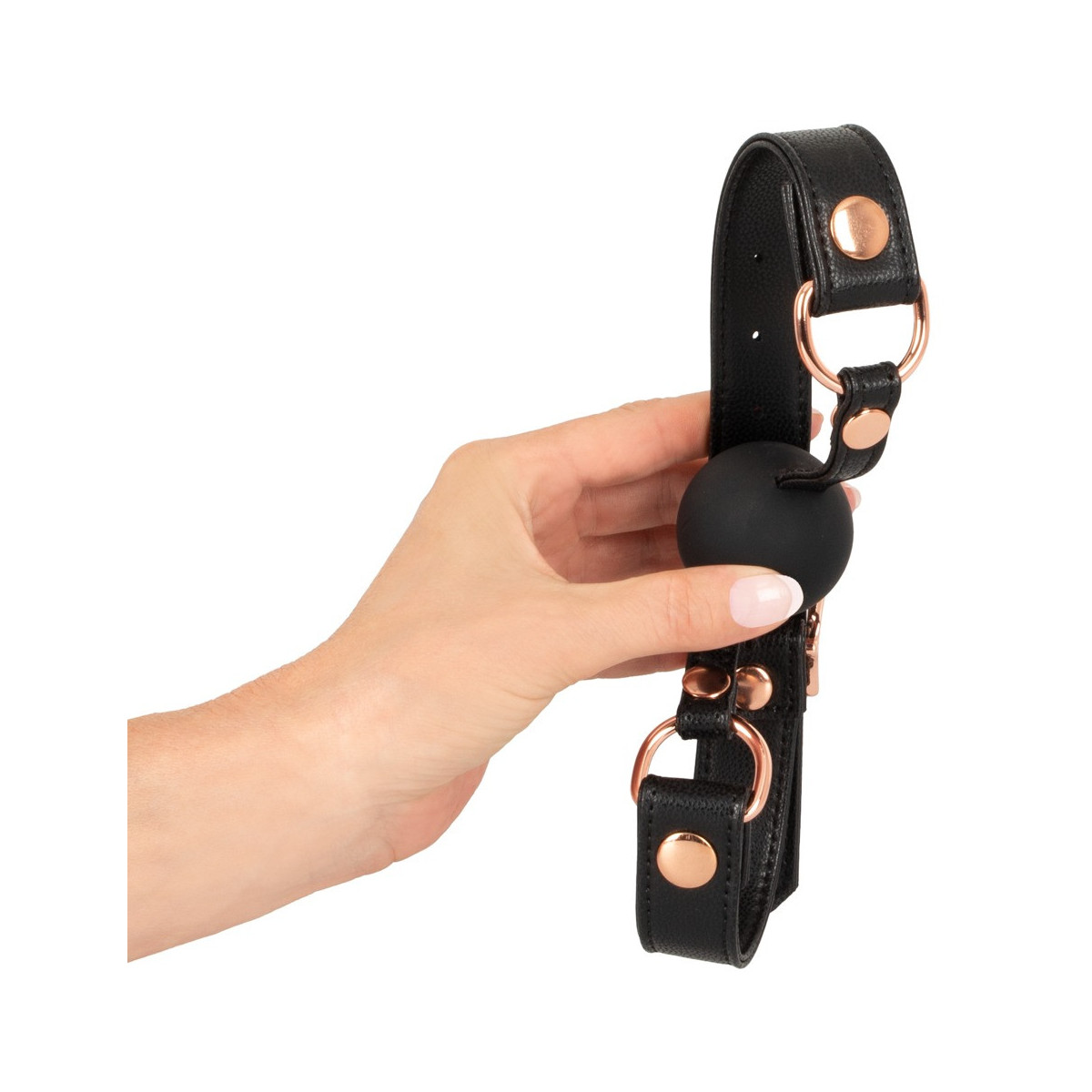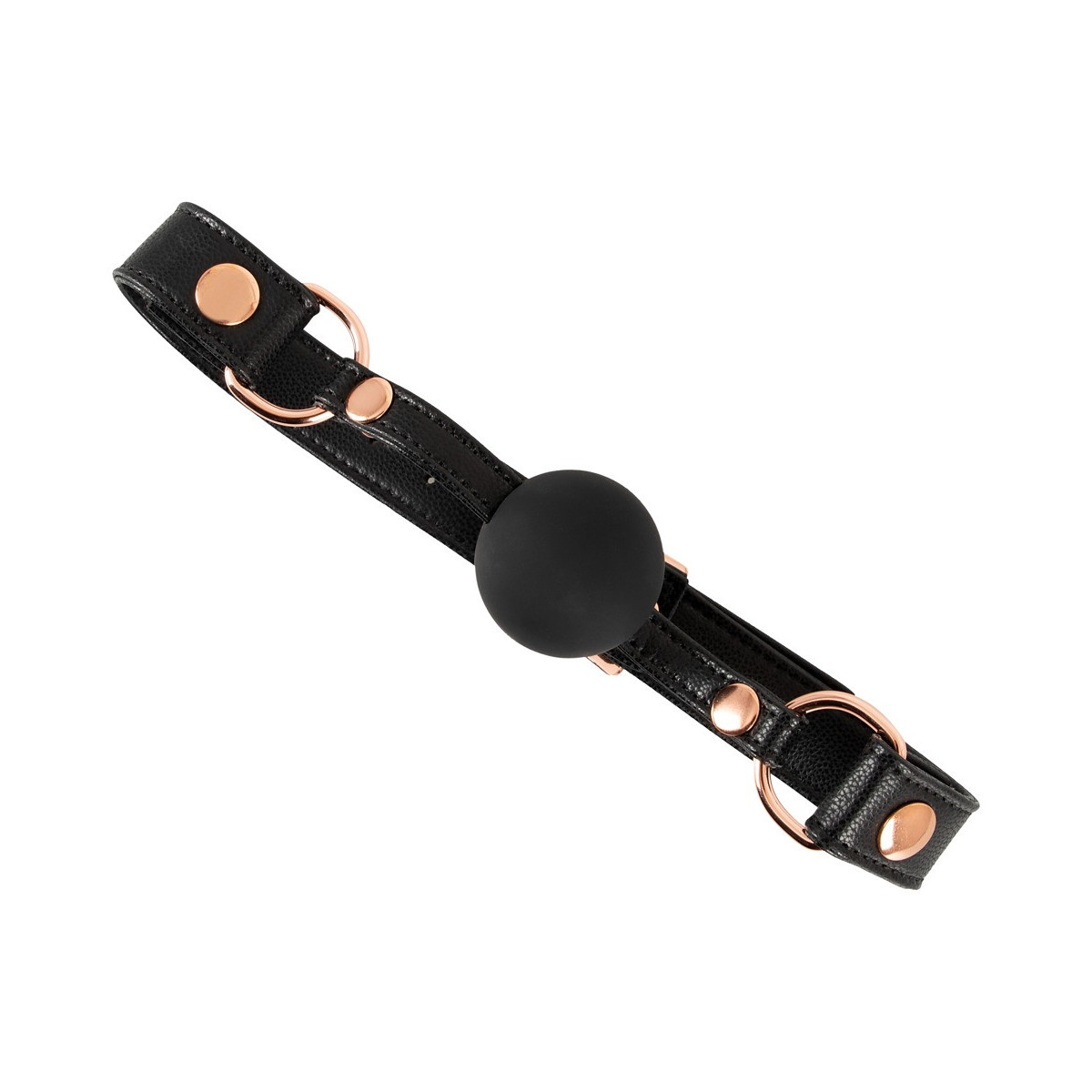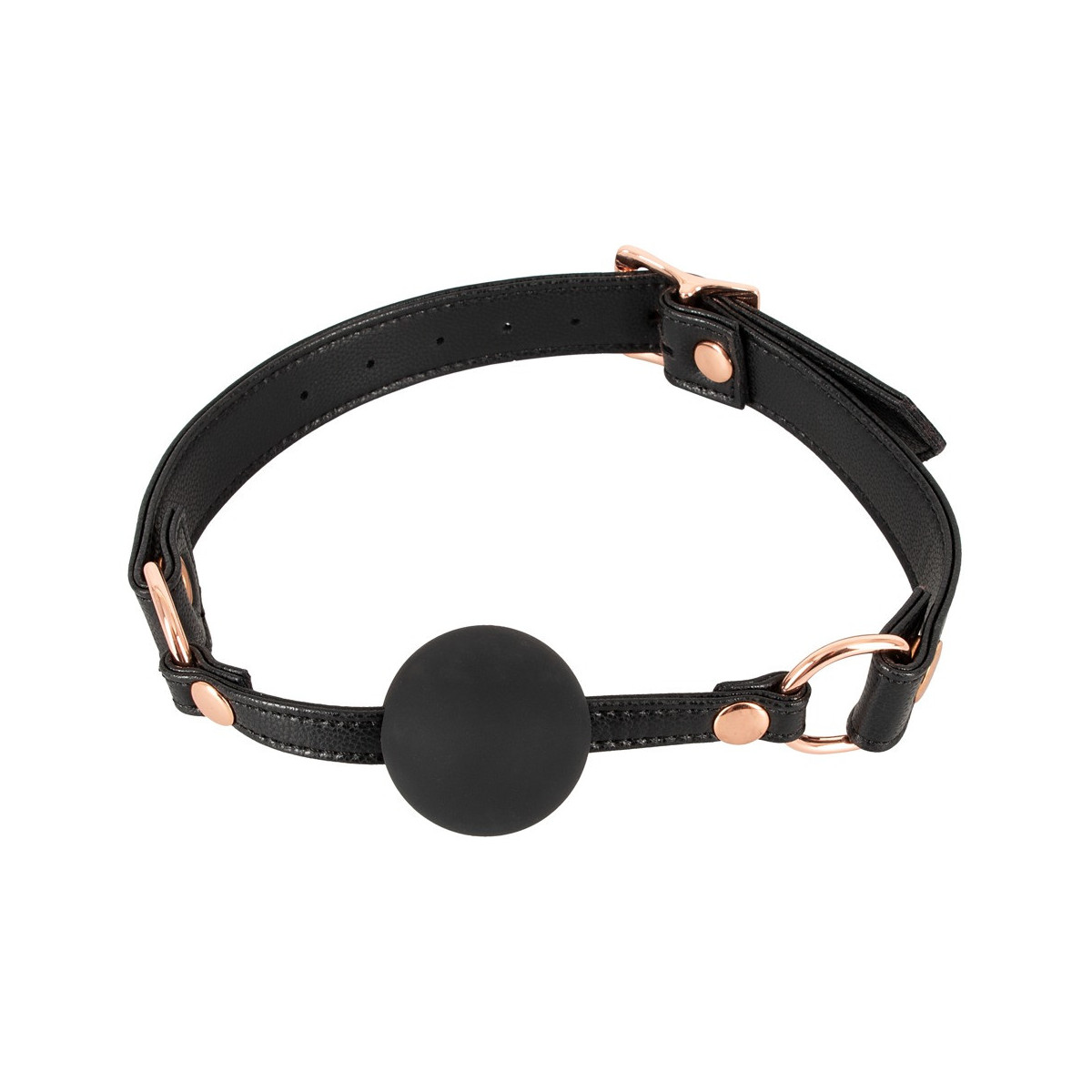 Per i giochi di lussuria e sottomissione, questa gag di Bad Kitty è l'accessorio perfetto. Palla rotonda in silicone a prova di morso (Ø 4 cm) su cinturino in pelle di alta qualità con elementi in metallo color oro rosa. Interno con rivestimento in morbido peluche e regolabile con chiusura a fibbia per adattarsi alla sua dimensione della testa. Nero.