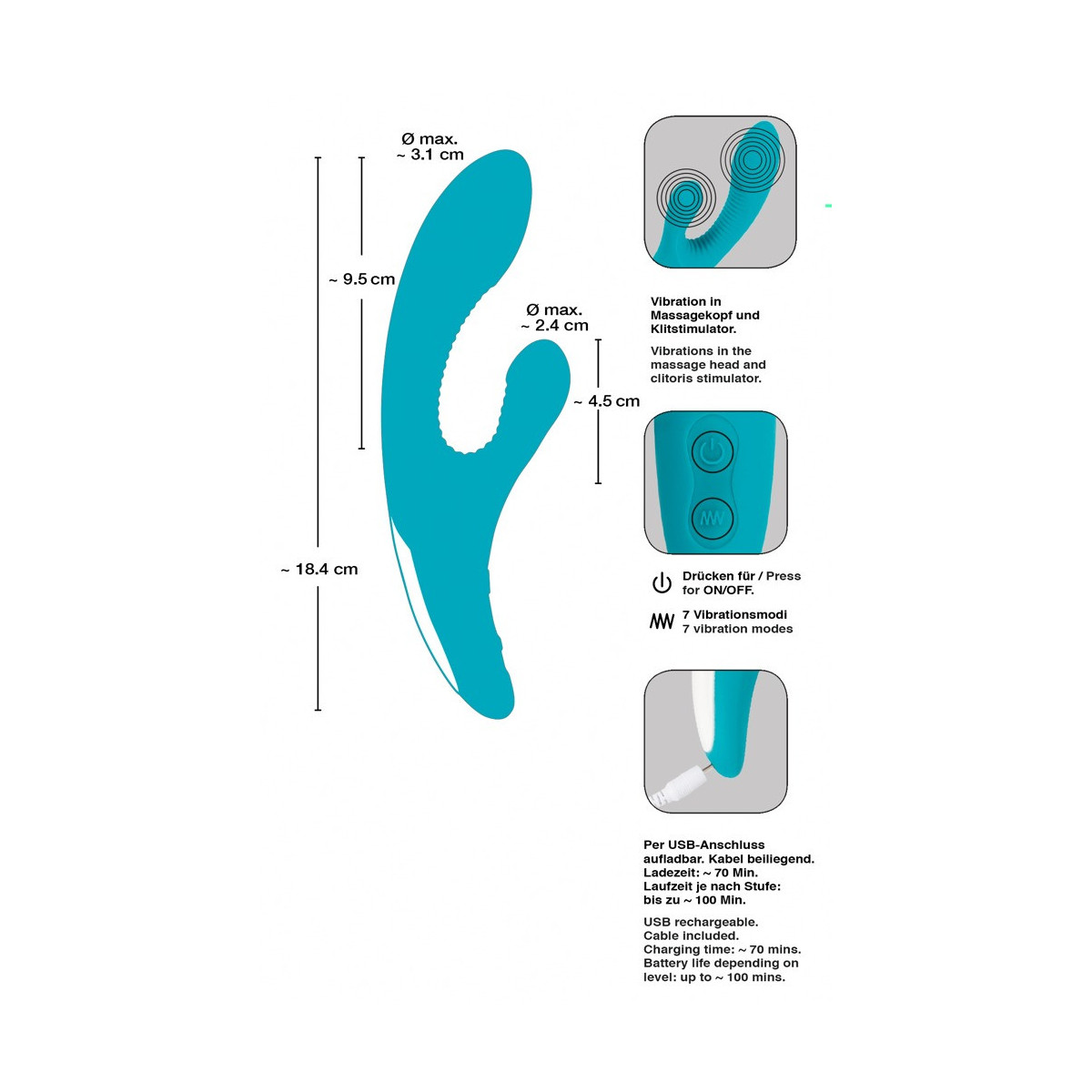 Lunghezza totale 18,4 cm, Ø 3,1 cm. Turchese. Silicone, PU, ABS.