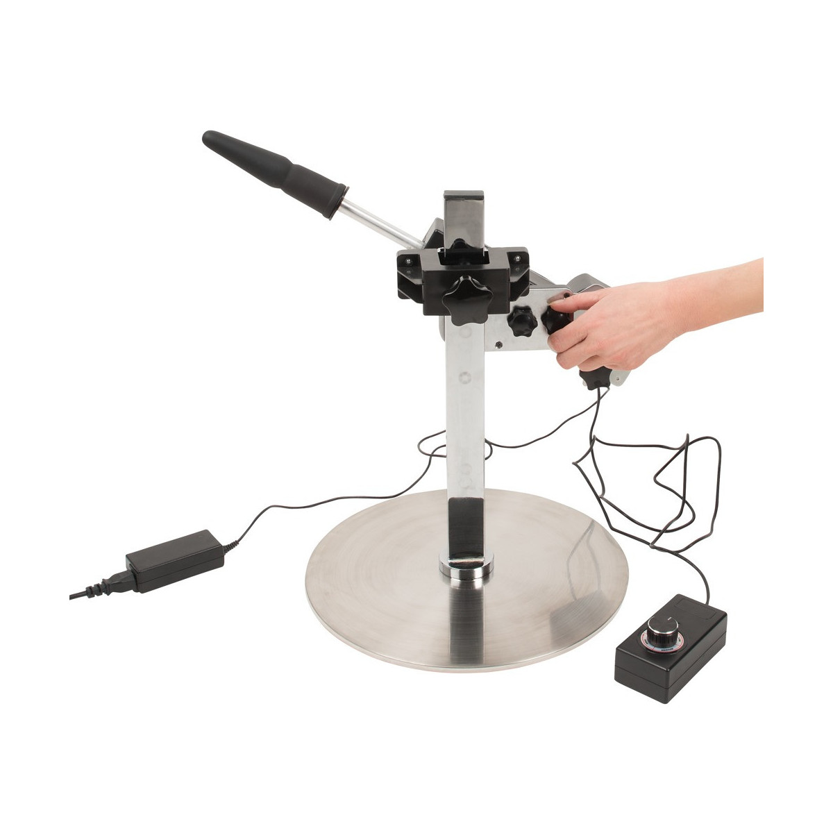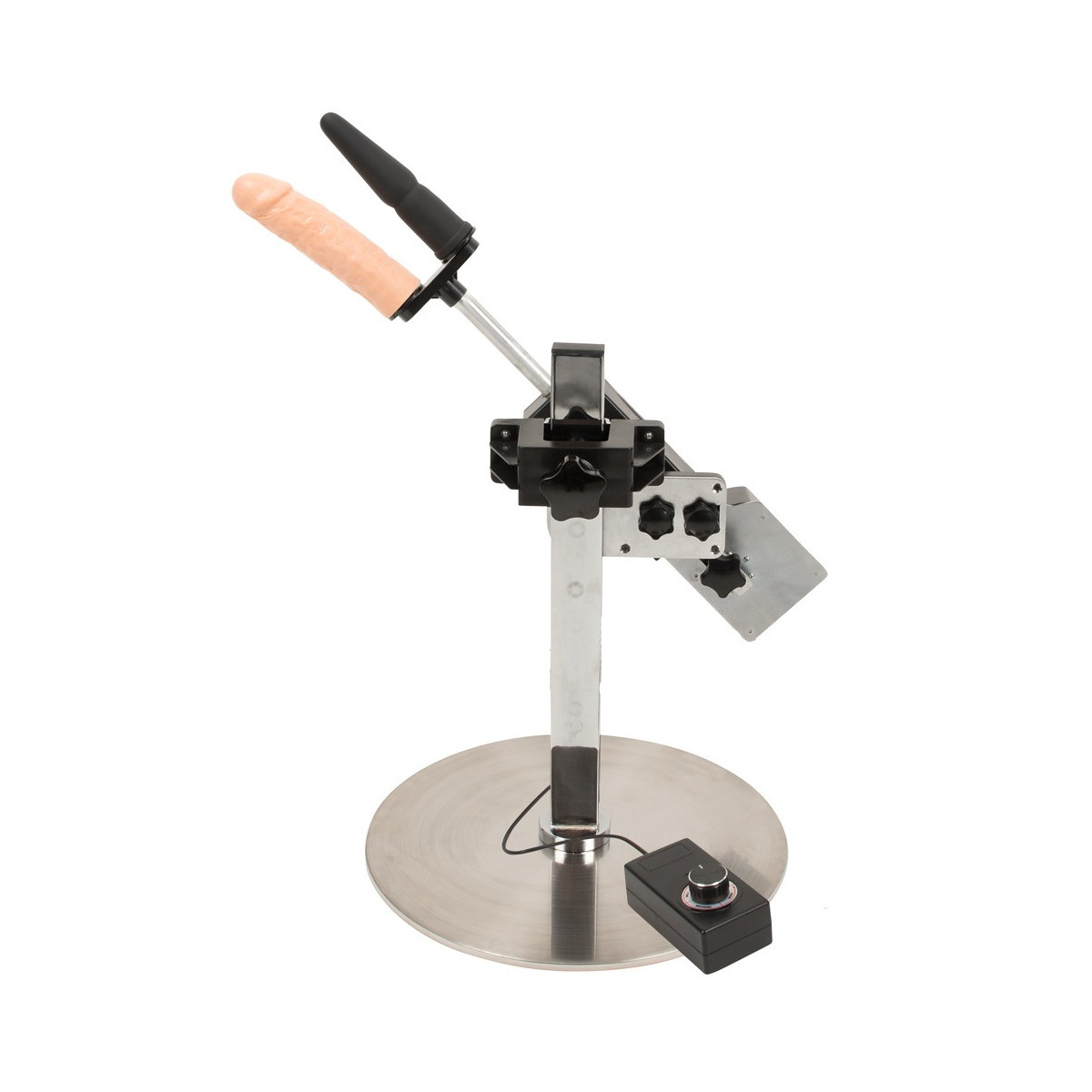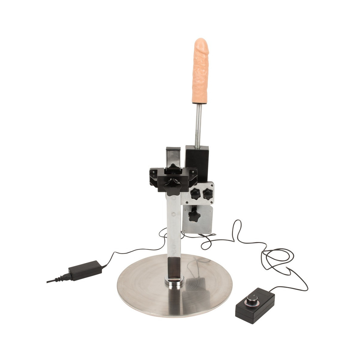 Macchina del sesso con supporto regolabile in altezza e due attacchi. Con telecomando per la regolazione e ruotabile a quasi 360°. La regolazione continua degli urti arriva fino a 150 colpi al minuto e la profondità dei colpi può essere regolata fino a 8 cm. Progettato per il funzionamento a mani libere e in un design snello e moderno per il massimo utilizzo. Lunghezza del cavo di 1,5 metri con spina SchuKo tipo F. Attacco a spina per doppia penetrazione incluso.