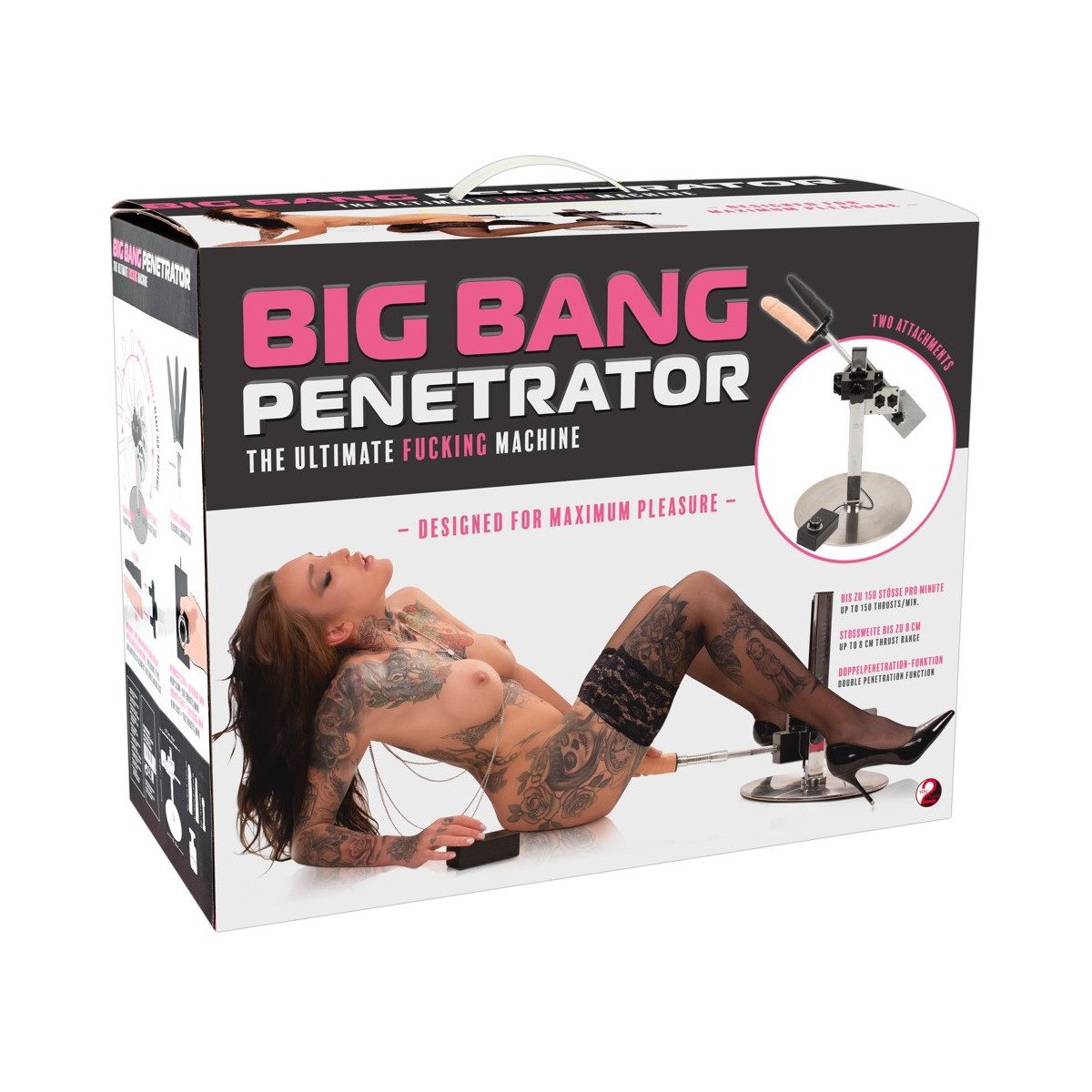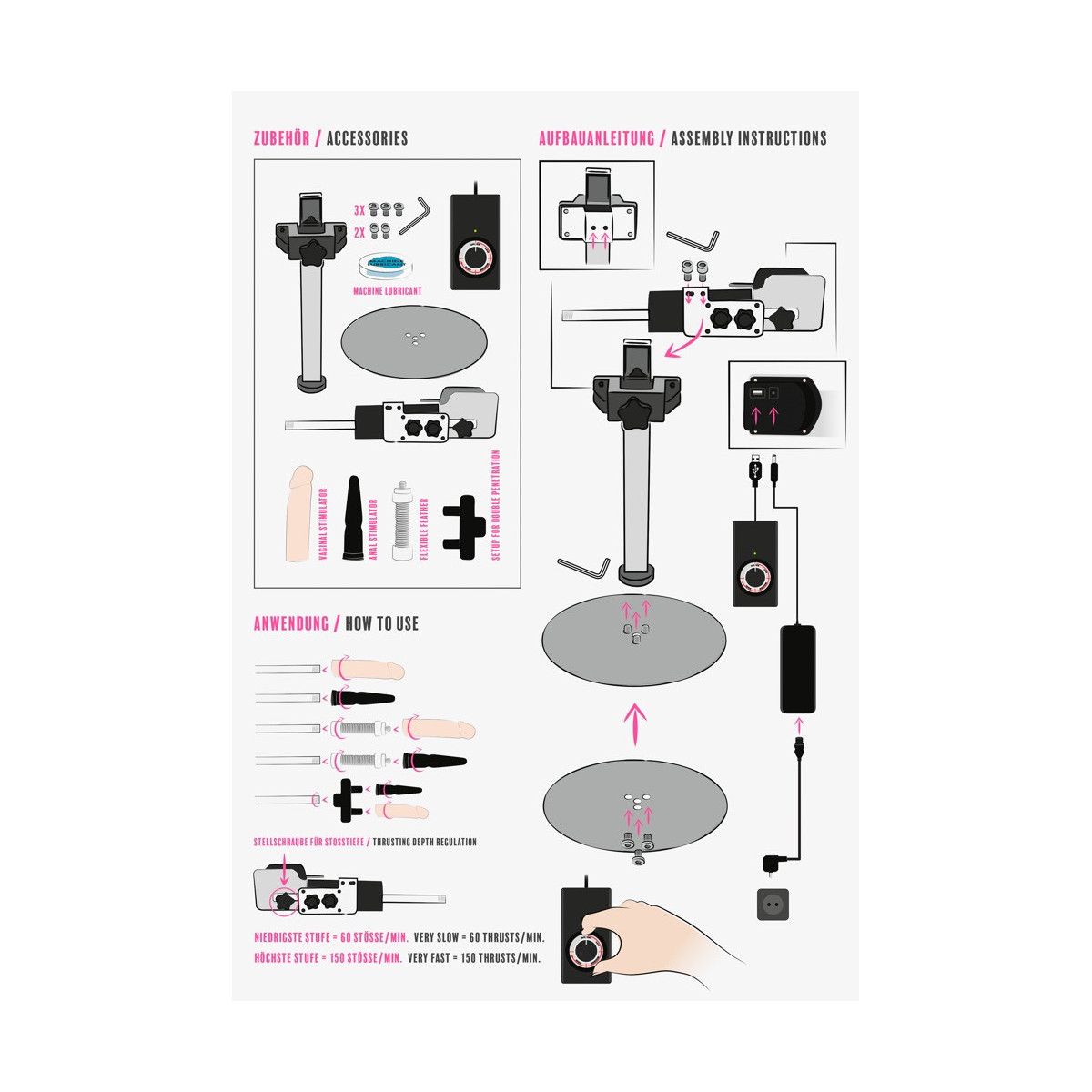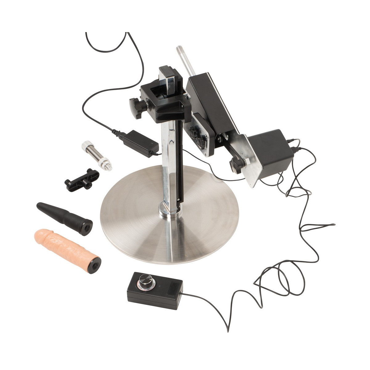 Macchina del sesso con supporto regolabile in altezza e due attacchi. Con telecomando per la regolazione e ruotabile a quasi 360°. La regolazione continua degli urti arriva fino a 150 colpi al minuto e la profondità dei colpi può essere regolata fino a 8 cm. Progettato per il funzionamento a mani libere e in un design snello e moderno per il massimo utilizzo. Lunghezza del cavo di 1,5 metri con spina SchuKo tipo F. Attacco a spina per doppia penetrazione incluso.