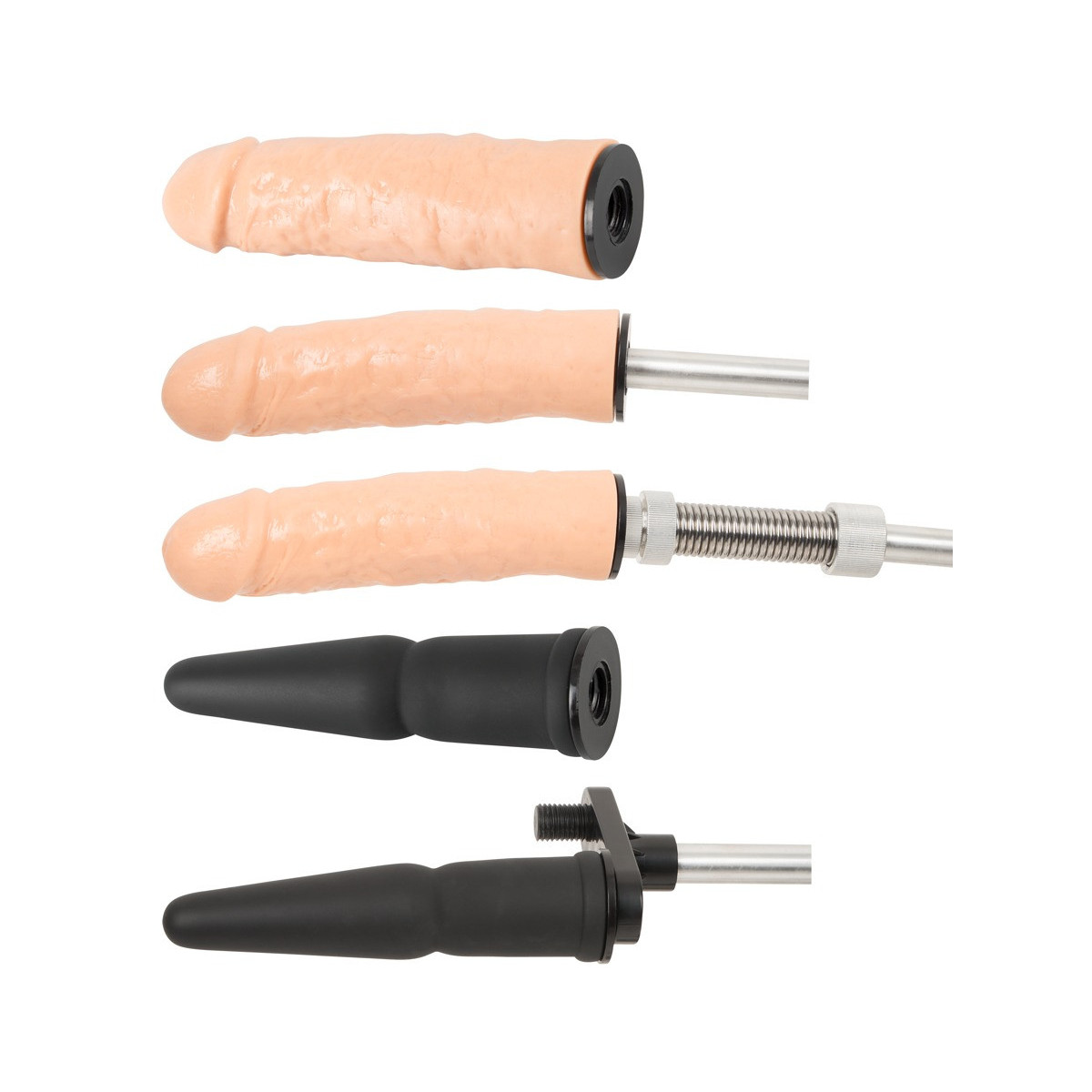 Lunghezza totale supporto 42 cm, dildo naturale 18 cm, dildo anale 16,5 cm. Acciaio inossidabile, ABS, silicone, TPR.