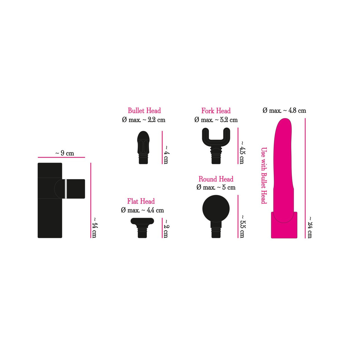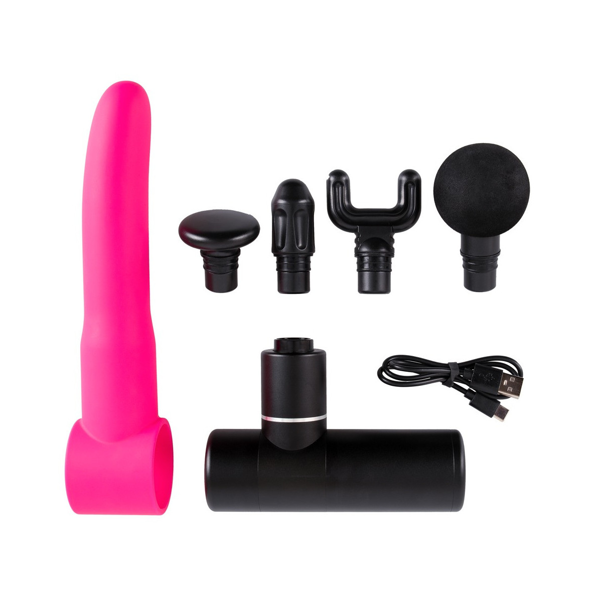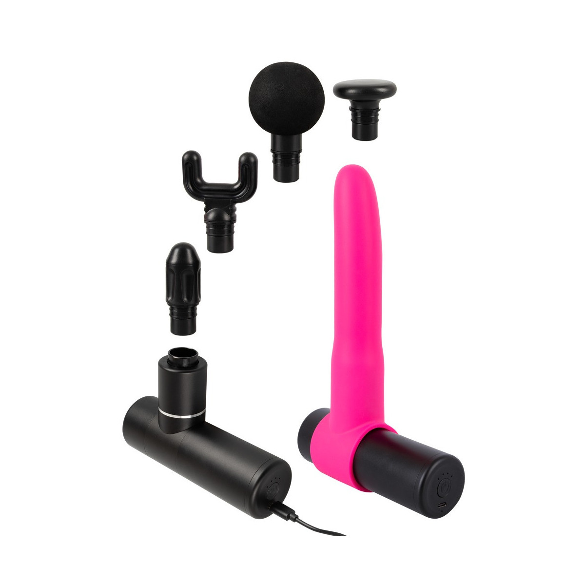 Massage Gun Sex & Massage Gun di You2Toys con 4 attacchi diversi e un dildo in silicone grassoccio da attaccare. Il massaggiatore portatile funziona con scosse veloci, dirette e potenti che vengono trasferite al rispettivo attacco o dildo, ma sono appena percettibili nel manico. 4 velocità di shock (da 1600 a 3200 shock al minuto) sono comodamente controllabili al tocco di un pulsante direttamente sul manico e forniscono un piacere di massaggio versatile (profondo) - nel e sul corpo. Con un volume di < 55 decibel molto silenzioso e discreto. Con un peso di soli 521 g, la pistola da massaggio compatta sta comodamente in mano, è piacevole da impugnare ed è pronta all'uso rapidamente e in movimento. Ricaricabile - cavo di ricarica USB incluso.