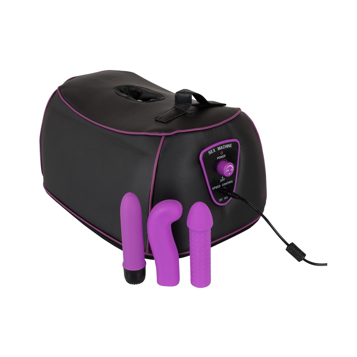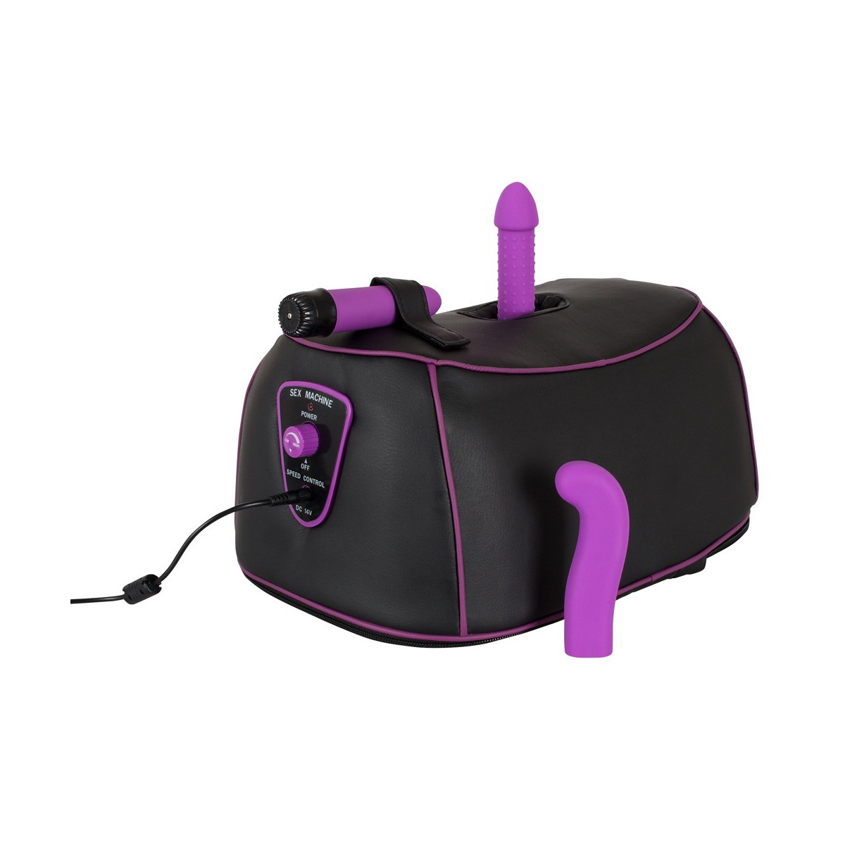 Macchina da sesso nera con due diversi accessori e vibratore montabile per una stimolazione supplementare. Regolazione infinitamente variabile del movimento rotatorio per un massaggio mirato delle zone G e P. In rete.