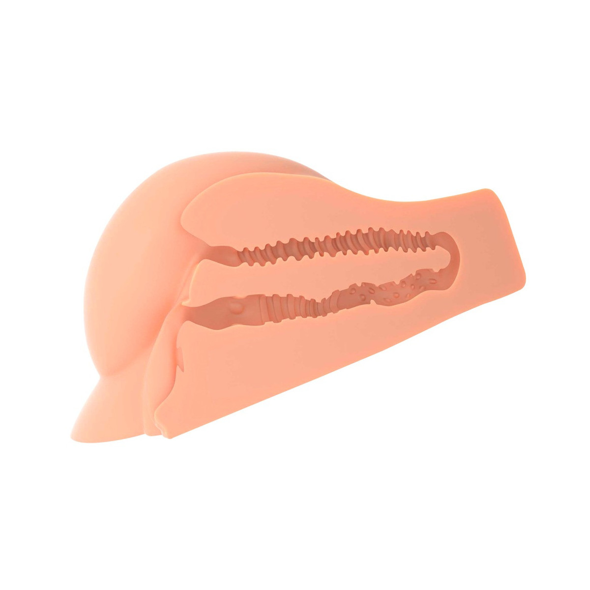 Con un peso di oltre 5 kg, il massiccio busto si adagia saldamente e in modo antiscivolo su qualsiasi superficie liscia e può anche essere penetrato a mani libere. I tunnel del piacere sono collegati tra loro per una facile pulizia.
