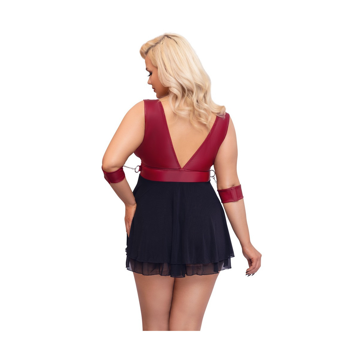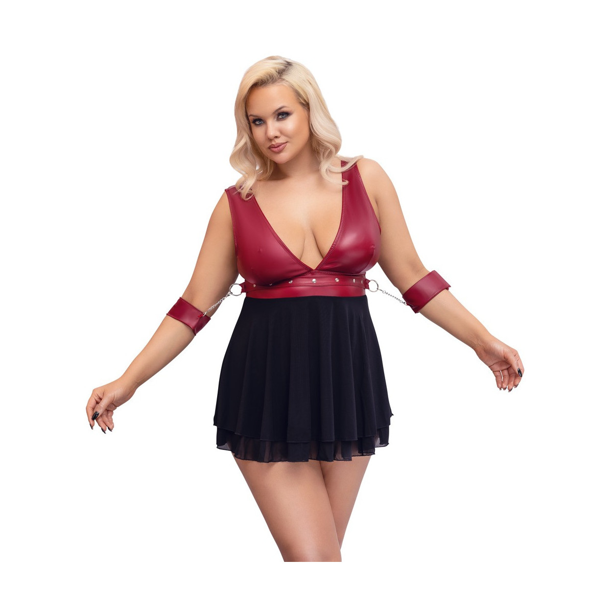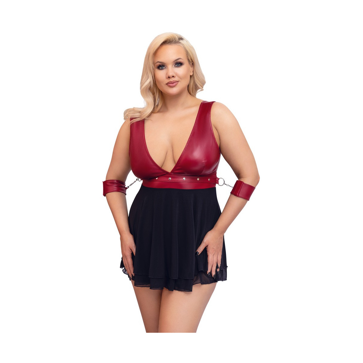 Babydoll corto di Cottelli BONDAGE PLUS in nobile look rosso opaco (top) misto a fine powernet (gonna). Il babydoll è scollato davanti e dietro, la gonna svasata è a doppio strato. Sul davanti è presente una cintura cucita con rivetti, ai cui anelli laterali possono essere agganciati i polsini delle braccia con le loro corte catene a moschettone. I polsini si indossano rapidamente grazie alle chiusure in velcro e possono essere regolati in base alle esigenze.