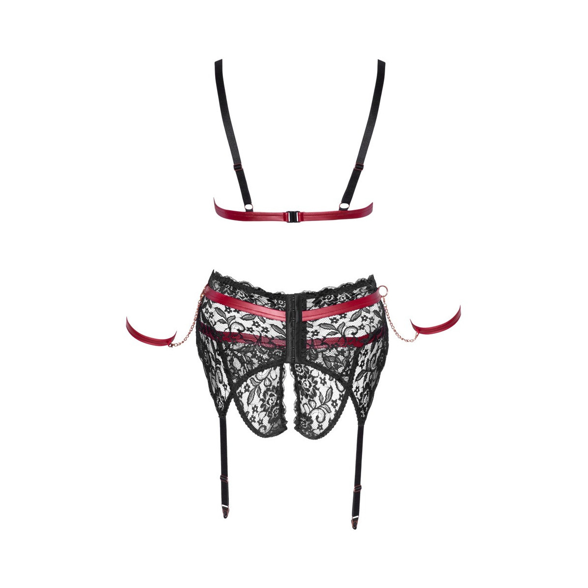 Morbido reggiseno, reggicalze e mutandine inguinali di Cottelli BONDAGE in pizzo nero elastico con sofisticati dettagli in look rosso scuro opaco oltre a elementi in oro rosa e borchie cool. Reggiseno con spalline leggermente più larghe e regolabili, chiusura con gancio sulla schiena. Le manette chiuse con le loro catene a moschettone possono essere agganciate agli anelli sul lato del reggicalze. Il reggicalze ha una chiusura a gancio sul retro e bretelle regolabili. Le mutandine crotchless completano questo eccitante trio.