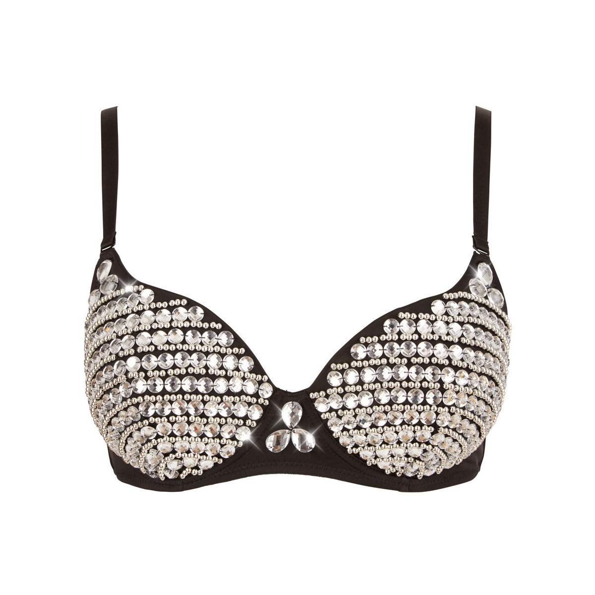 Reggiseno con ferretto e coppe leggermente imbottite con perle e pietre. Piccole barre sui lati, chiusura a gancio nella parte posteriore. Cinghie regolabili e rimovibili.