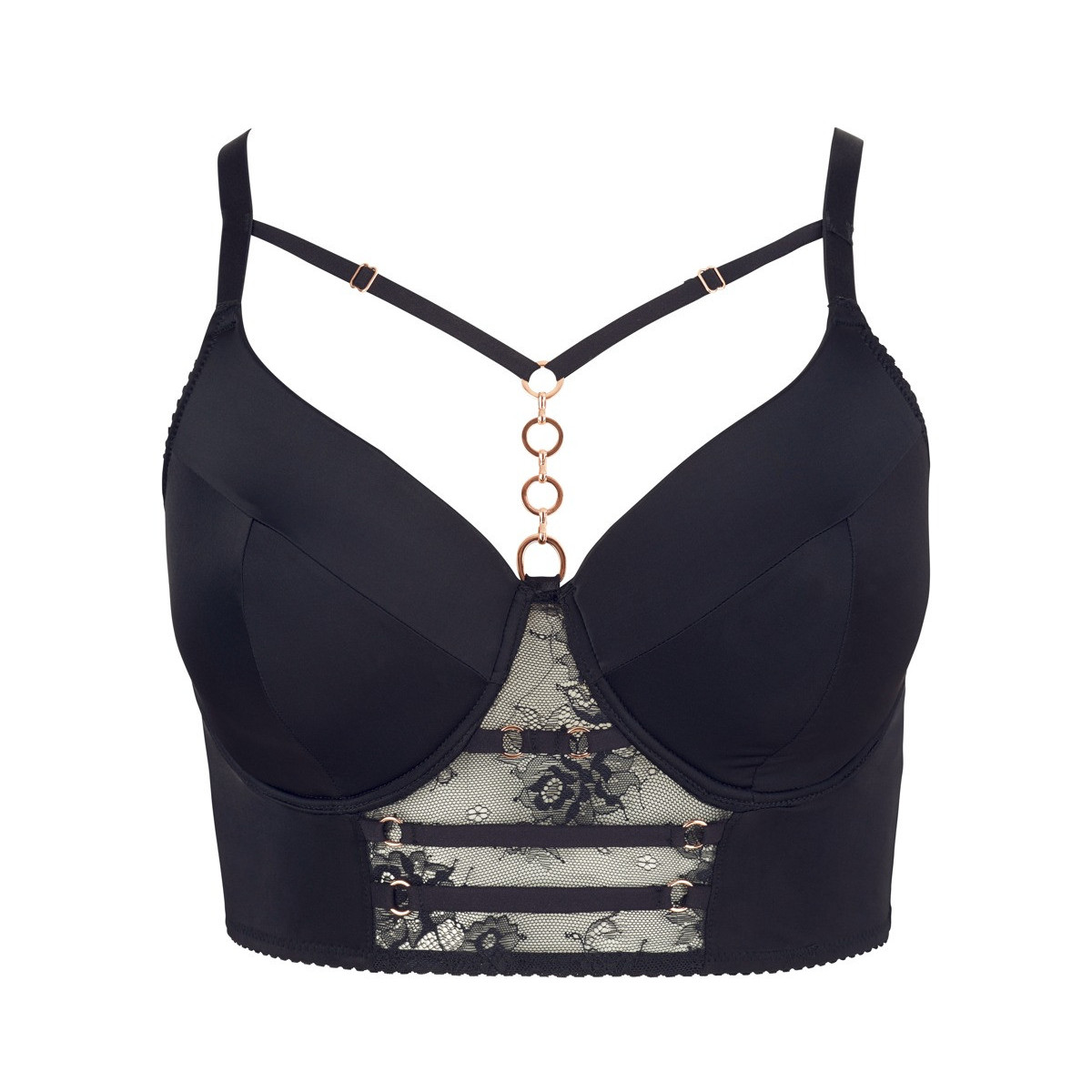 Reggiseno longline con coppe con ferretto leggermente foderato. Le sofisticate fasce per le coppe e le spalline sono regolabili per una perfetta vestibilità. Nero, con dettagli in oro rosa. Materiale opaco ed elastico
