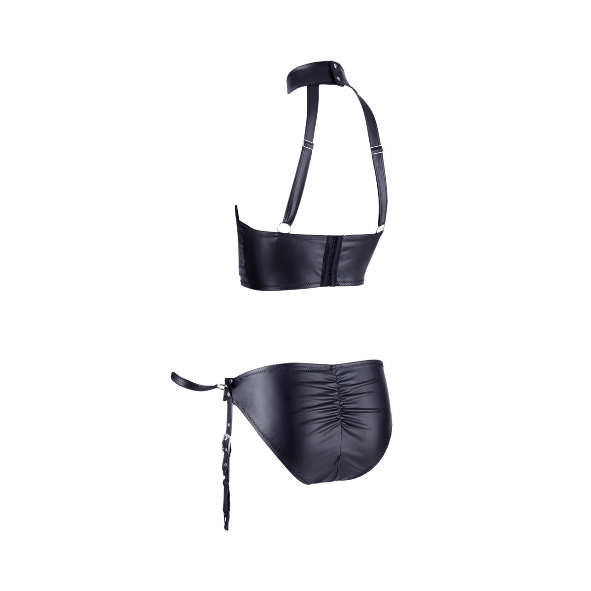 Eccitante reggiseno ouvert e sofisticate mutandine con bretelle in un set. Reggiseno con ferretti a coppa e fascia sottoseno regolabile. Le cinghie o i cinturini al collo sono anche regolabili per una vestibilità ottimale. Gli slip hanno una cerniera a 2 vie nel cavallo e una cucitura arricciata alla moda sul fondo. Le quattro bretelle sono anche regolabili con chiusure a fibbia. Su ogni lato dello slip, gli stretti polsini in velcro allegati possono essere attaccati ad anelli.