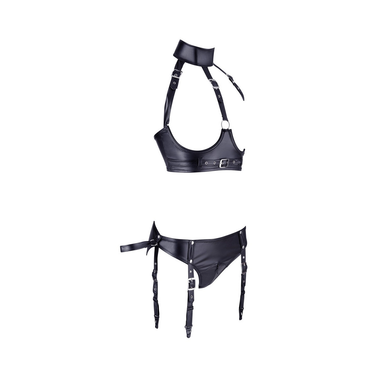 Eccitante reggiseno ouvert e sofisticate mutandine con bretelle in un set. Reggiseno con ferretti a coppa e fascia sottoseno regolabile. Le cinghie o i cinturini al collo sono anche regolabili per una vestibilità ottimale. Gli slip hanno una cerniera a 2 vie sul cavallo e una cucitura arricciata alla moda sul fondo. Le quattro bretelle sono anche regolabili con chiusure a fibbia. Su ogni lato dello slip, gli stretti polsini in velcro allegati possono essere attaccati ad anelli.