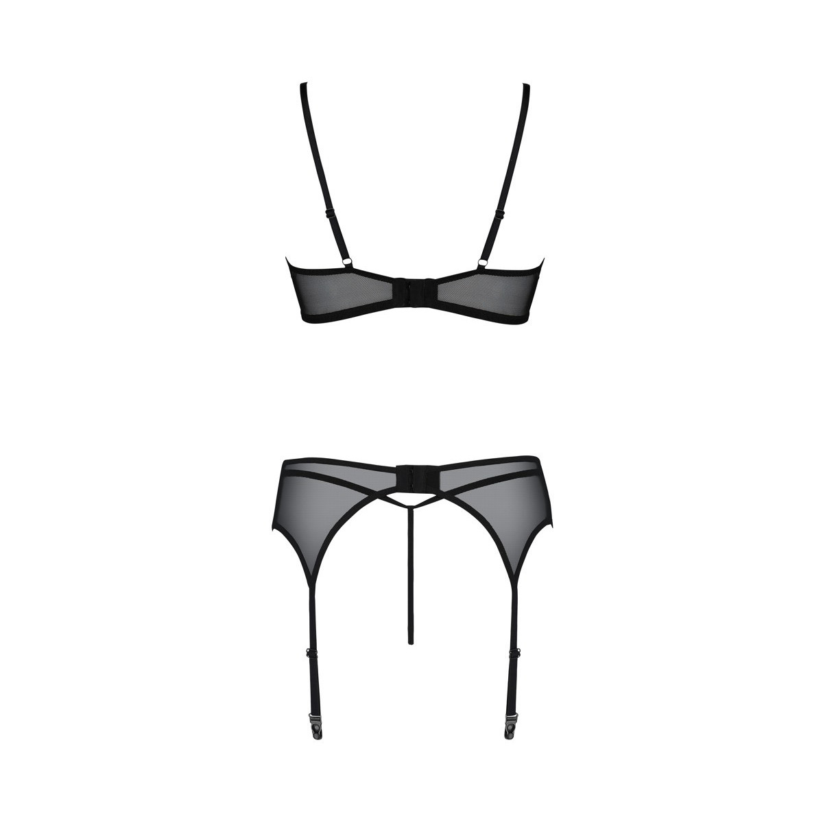 Reggiseno con ferretto, reggicalze e perizoma nel set Primula della collezione Eco di Passion. Tutti e tre i pezzi sono fatti di powernet elastico trasparente. Reggicalze sul davanti con fine pizzo bruciato e due tagli, proprio come le coppe con ferretto del reggiseno. Entrambi i pezzi di lingerie con chiusura a gancio sul retro, i reggicalze e le spalline del reggiseno sono regolabili per adattarsi.