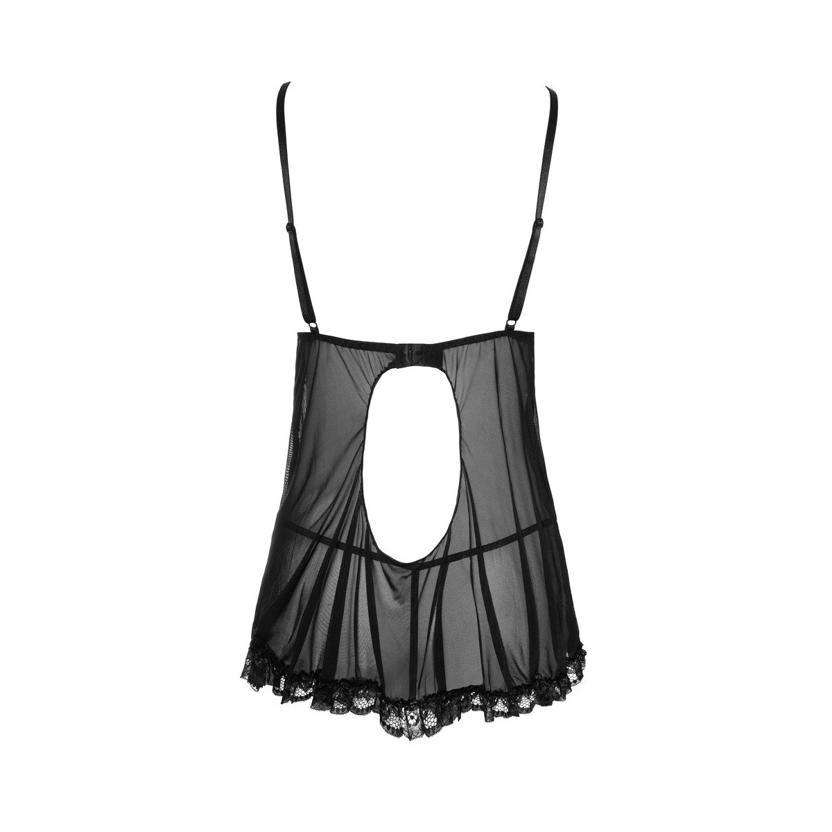 Babydoll con spalline regolabili e chiusura a gancio sulla schiena. Le coppe aperte da chiudere con un piccolo fiocco sono increspate, l'orlo è in pizzo. Perizoma incluso.
