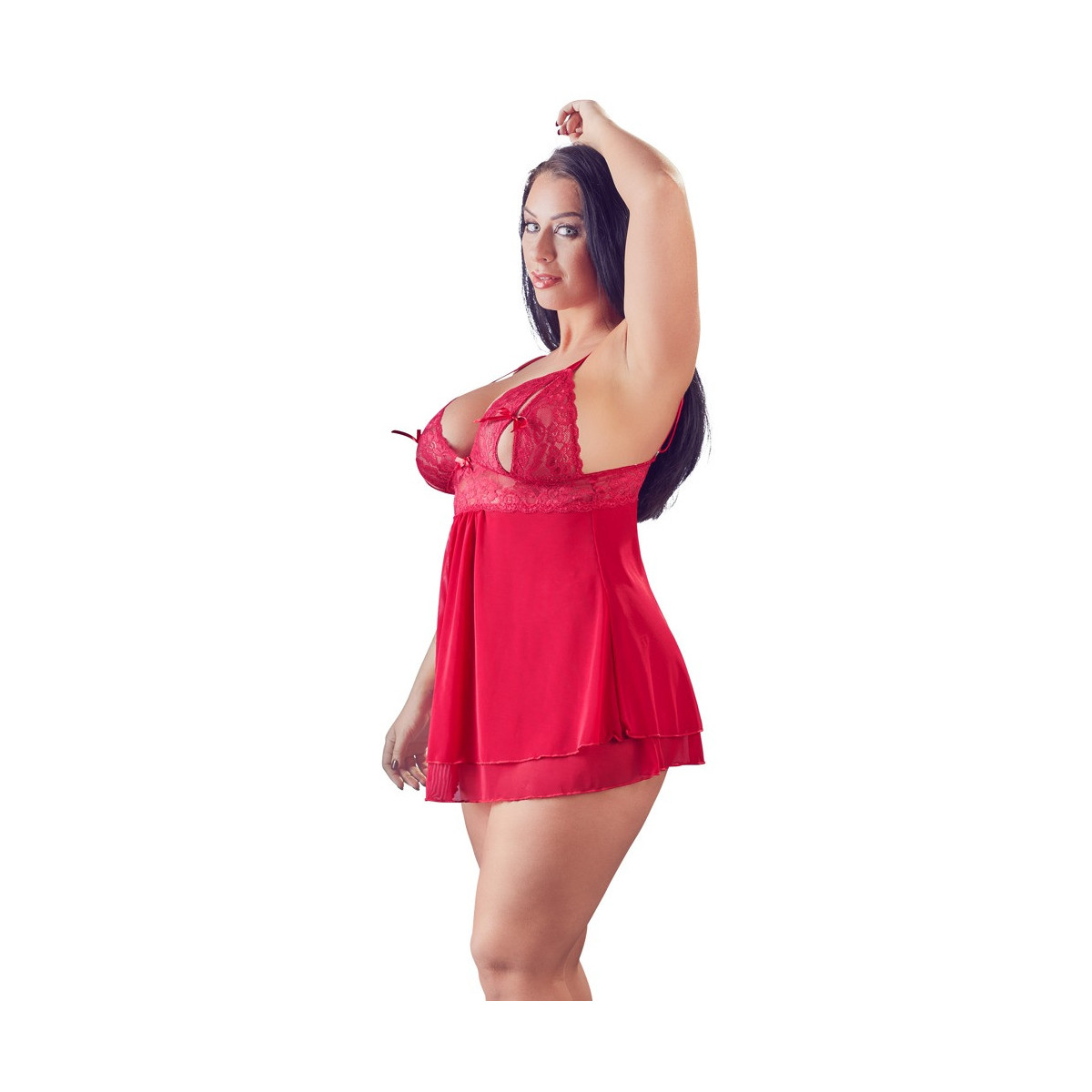 Babydoll rosso amore con passanti di legatura sulle coppe in pizzo a fessura e parte della gonna a doppio strato leggermente svasata, realizzata in Powernet. Schienale con chiusura a gancio, cinghie regolabili. 90% poliammide, 10% elastan.