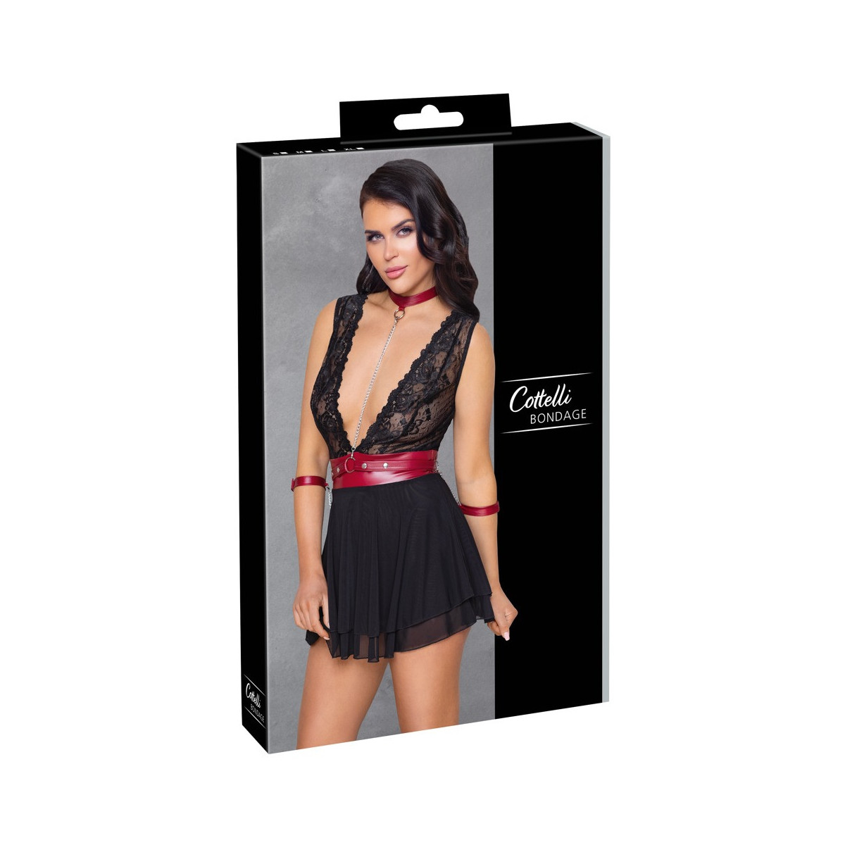Babydoll corto nero di Cottelli BONDAGE in un mix di delicato pizzo (top) e fine powernet (gonna) con inserti a contrasto che accentuano la vita in un nobile look rosso opaco. La cintura con le sue due manette su catene a scatto e la collana sono anche in un look rosso opaco. Il babydoll è tagliato extra basso davanti e dietro, la gonna svasata ha due strati. La catena a moschettone in dotazione può essere agganciata all'anello nella parte anteriore del collare con chiusura a pressione. La cintura e le cinghie delle manette con chiusure in velcro possono essere regolate per adattarsi e sono anche completamente rimovibili.