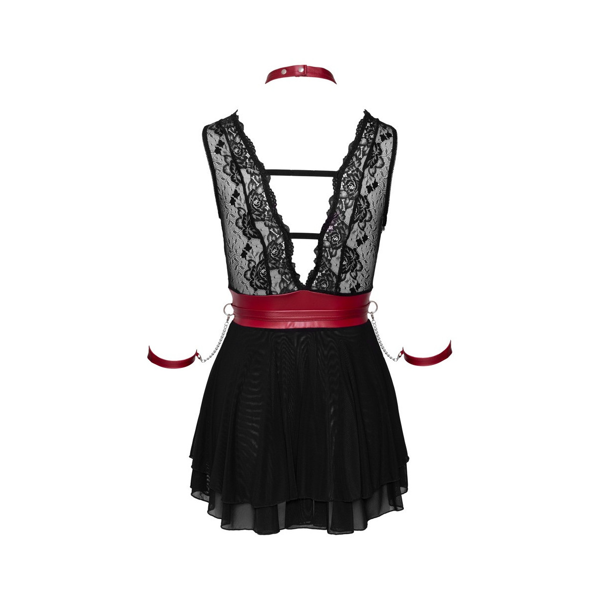 Babydoll corto nero di Cottelli BONDAGE in un mix di delicato pizzo (top) e fine powernet (gonna) con inserti a contrasto che accentuano la vita in un nobile look rosso opaco. La cintura con le sue due manette su catene a scatto e la collana sono anche in un look rosso opaco. Il babydoll è tagliato extra basso davanti e dietro, la gonna svasata ha due strati. La catena a moschettone in dotazione può essere agganciata all'anello nella parte anteriore del collare con chiusura a pressione. La cintura e le cinghie delle manette con chiusure in velcro possono essere regolate per adattarsi e sono anche completamente rimovibili.