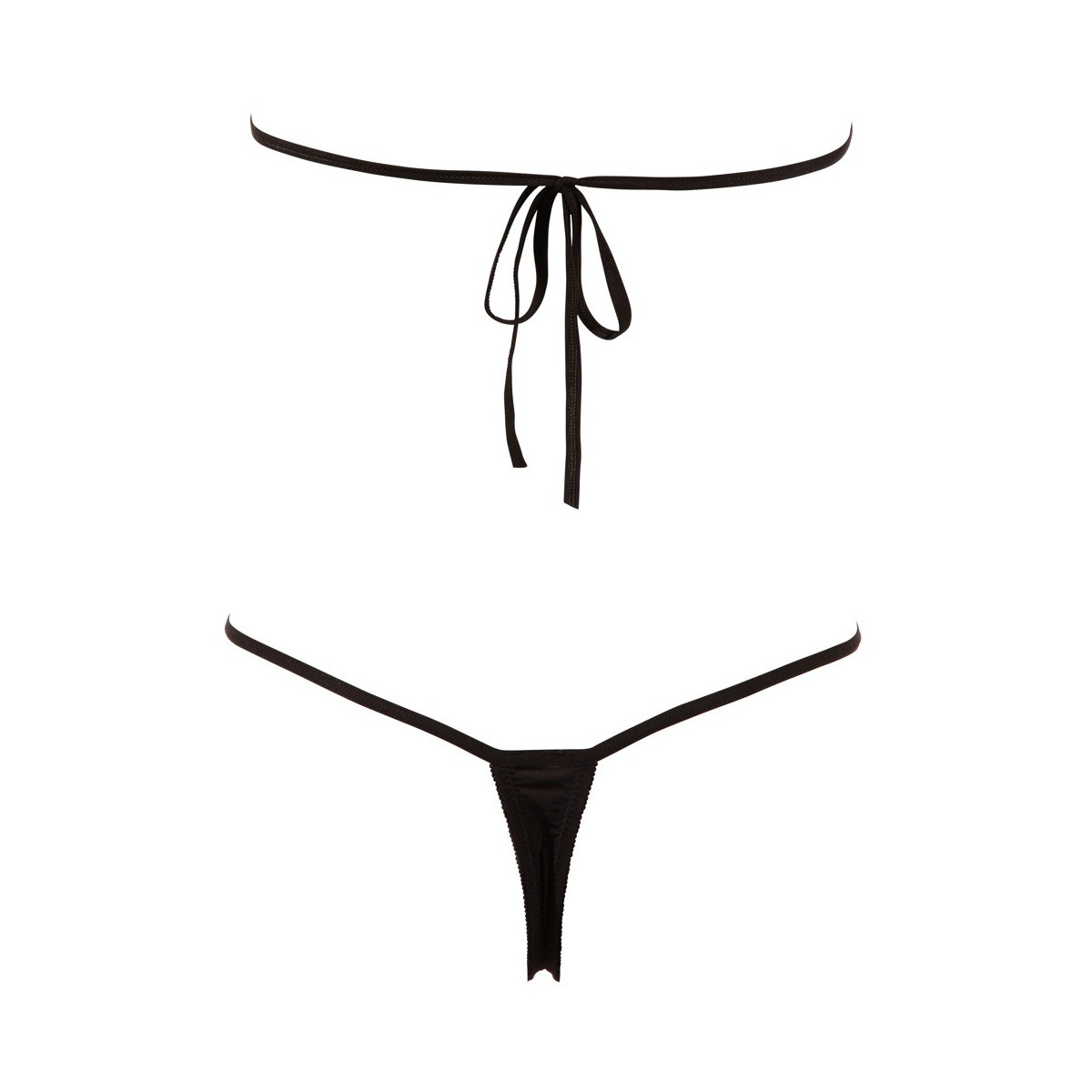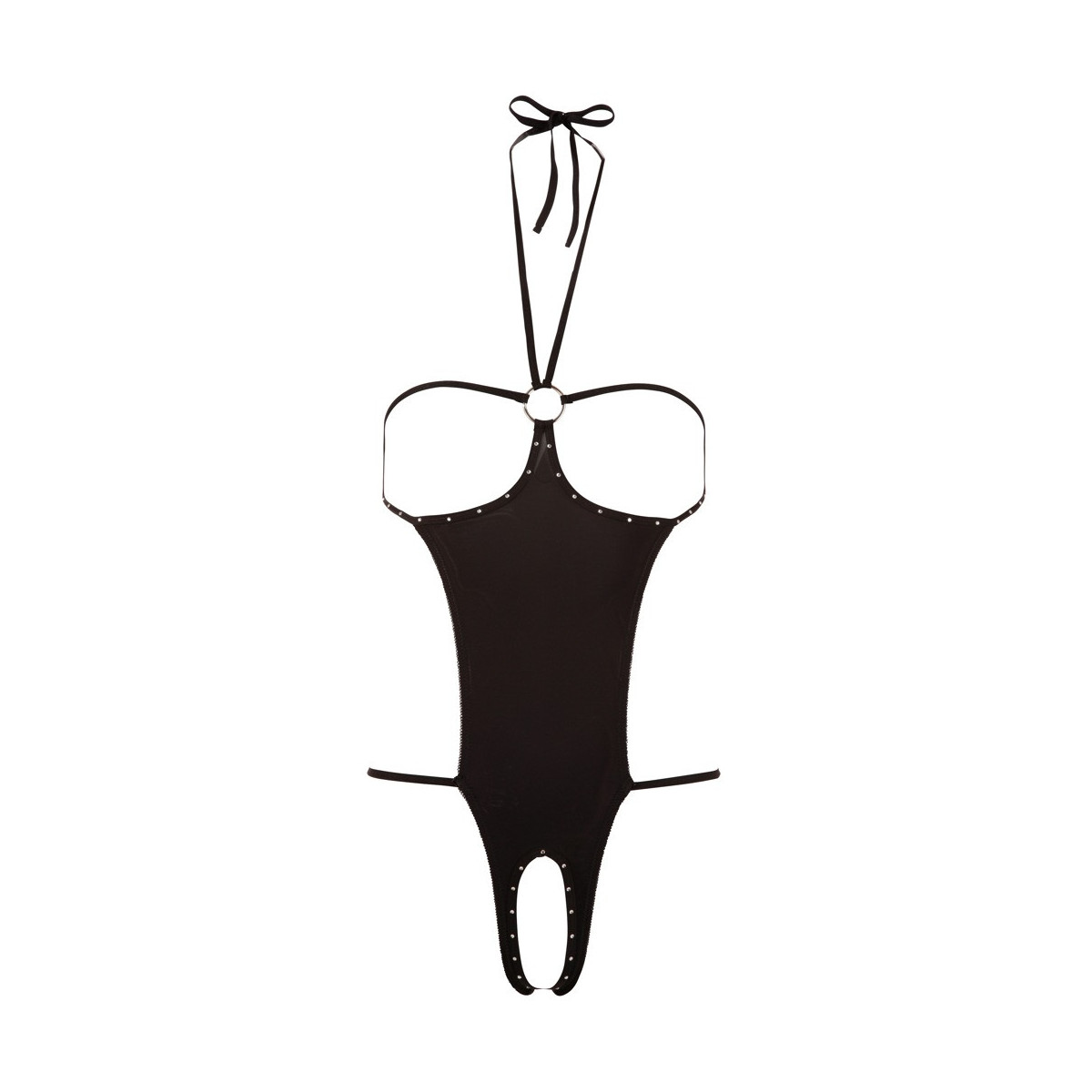 Provocante monopezzo con neckholder da legare e decorazione di strass sulle coppe scoperte e l‘apertura all‘inguine. Dietro solo string. Nero. 85% poliammide, 15% elastan.