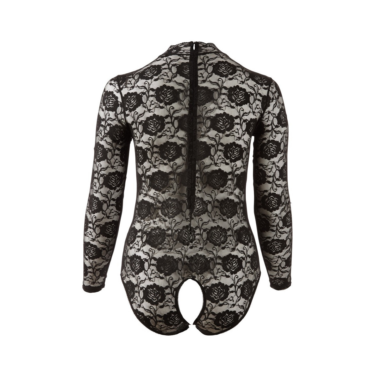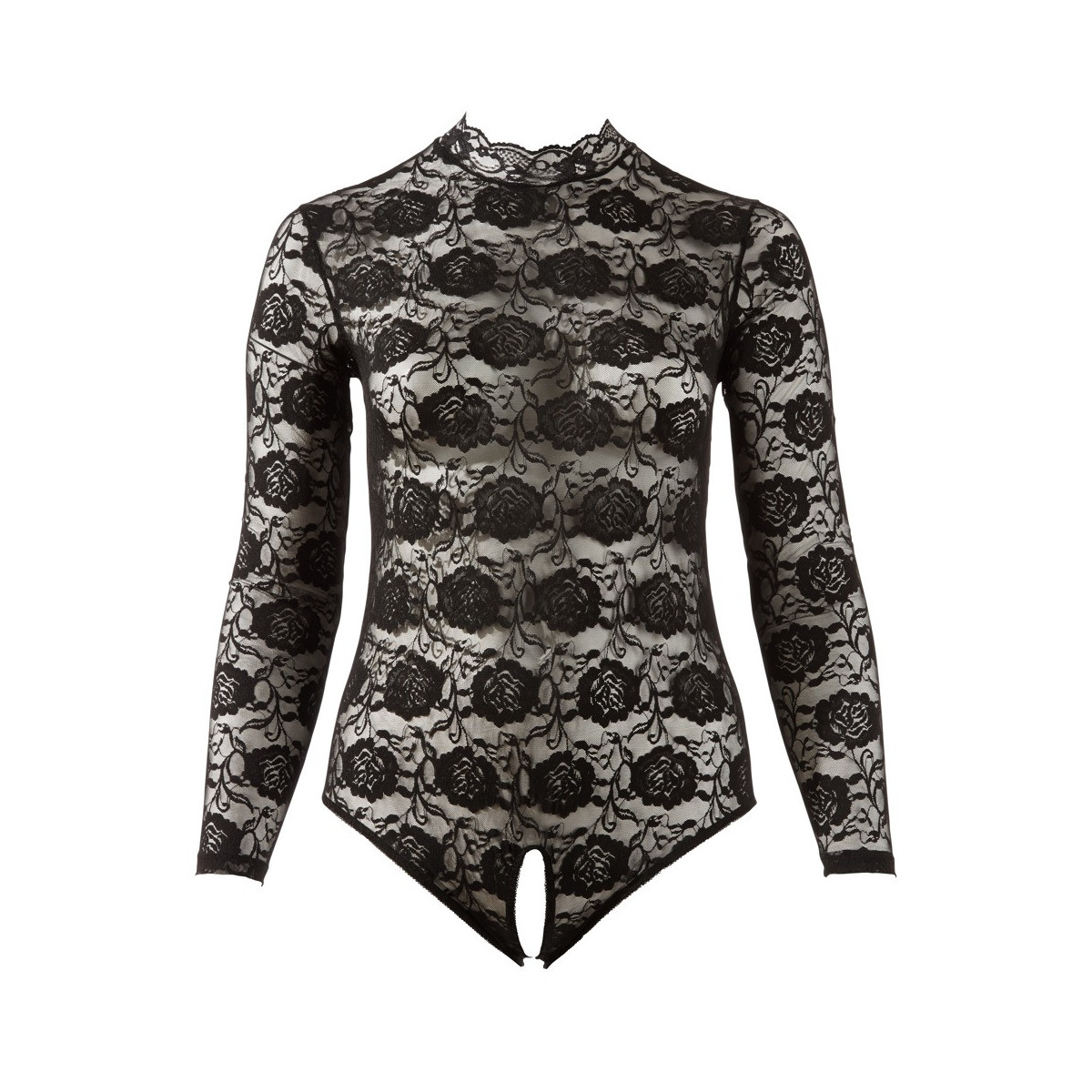 Corpo con maniche lunghe, colletto corto rialzato e cavallo aperto. Interamente in pizzo.