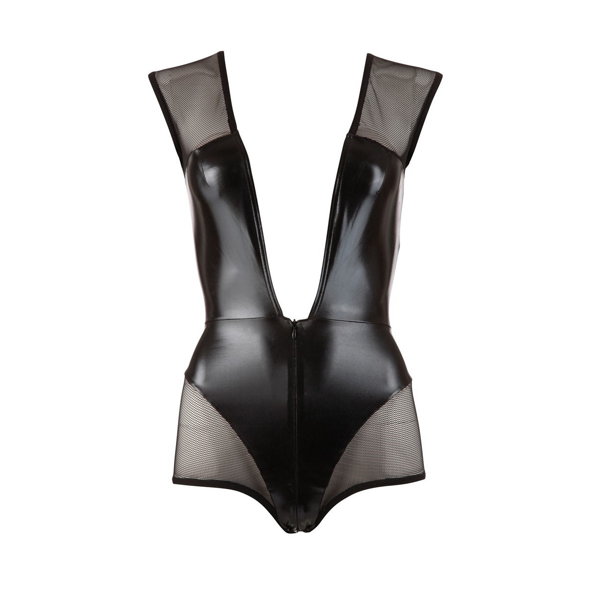 Corpo senza maniche realizzato in una combinazione di wetlook e rete in nero. Con cerniera lampo attraverso il cavallo.