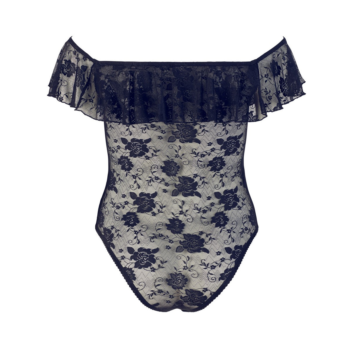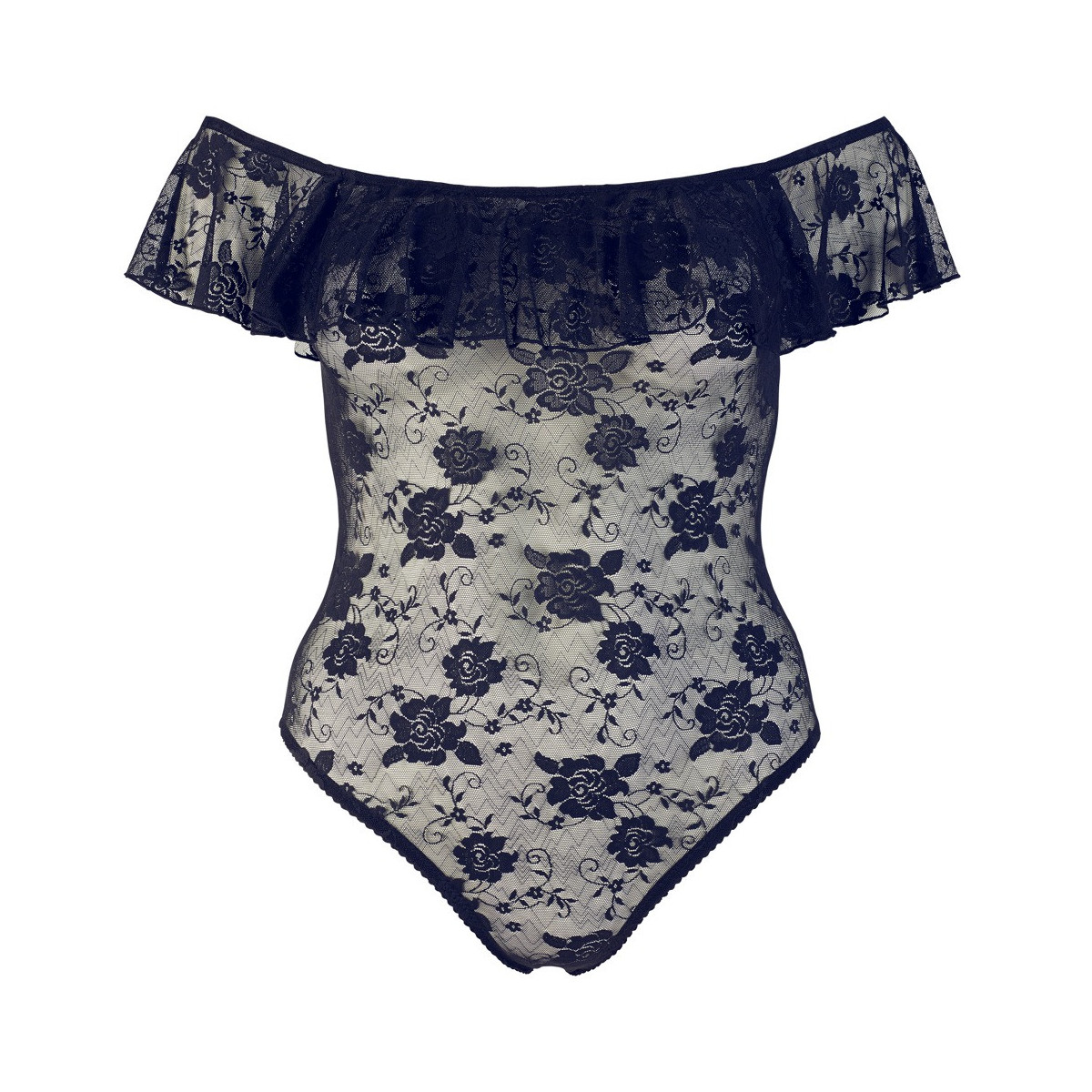 Monopezzo trasparente in morbido pizzo nero. Scollo elastico con ampia balza di pizzo può essere indossato anche sulla spalla à la Carmen. 90% poliammide, 10% elastan.