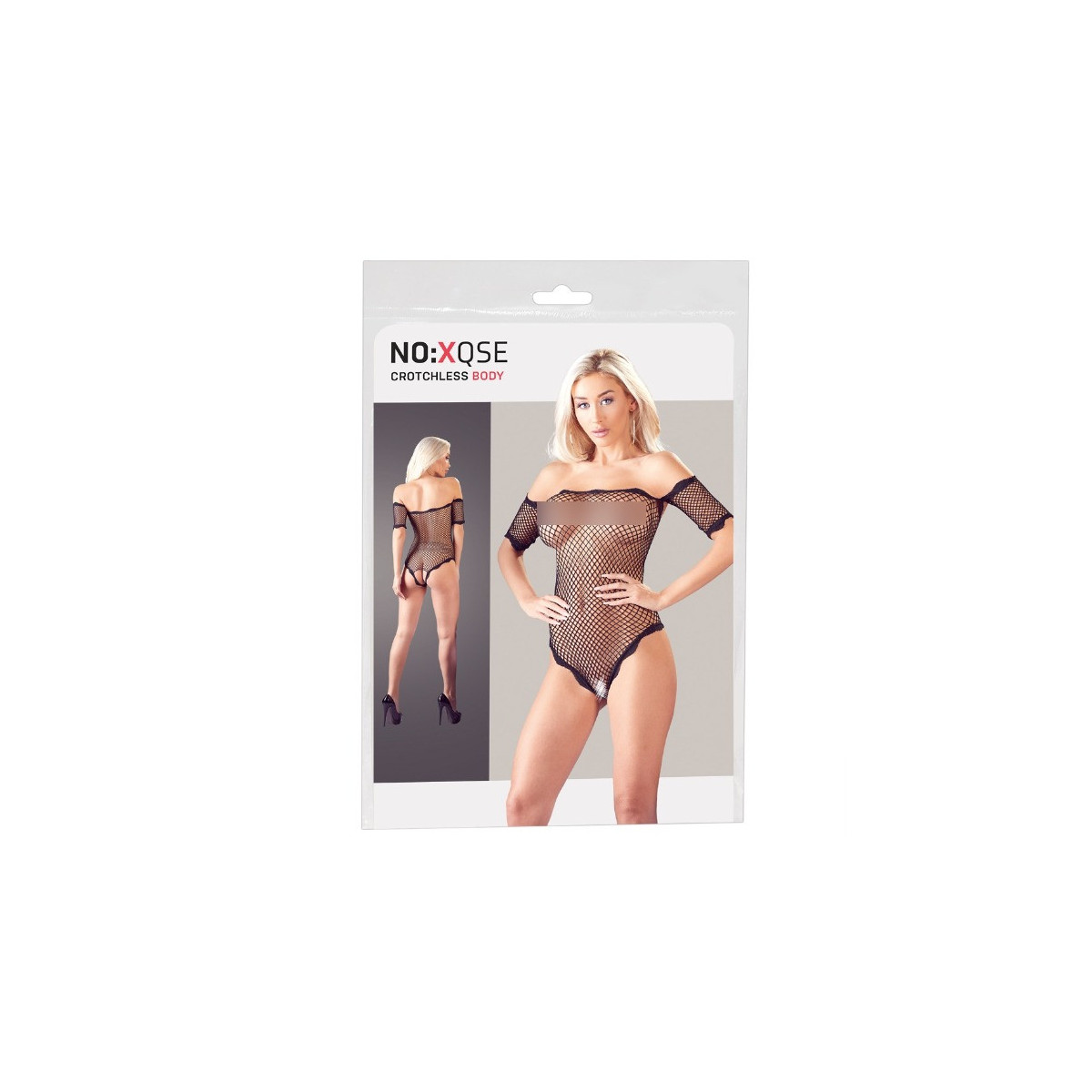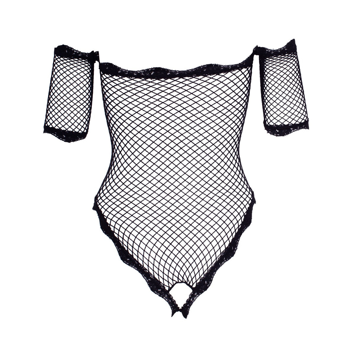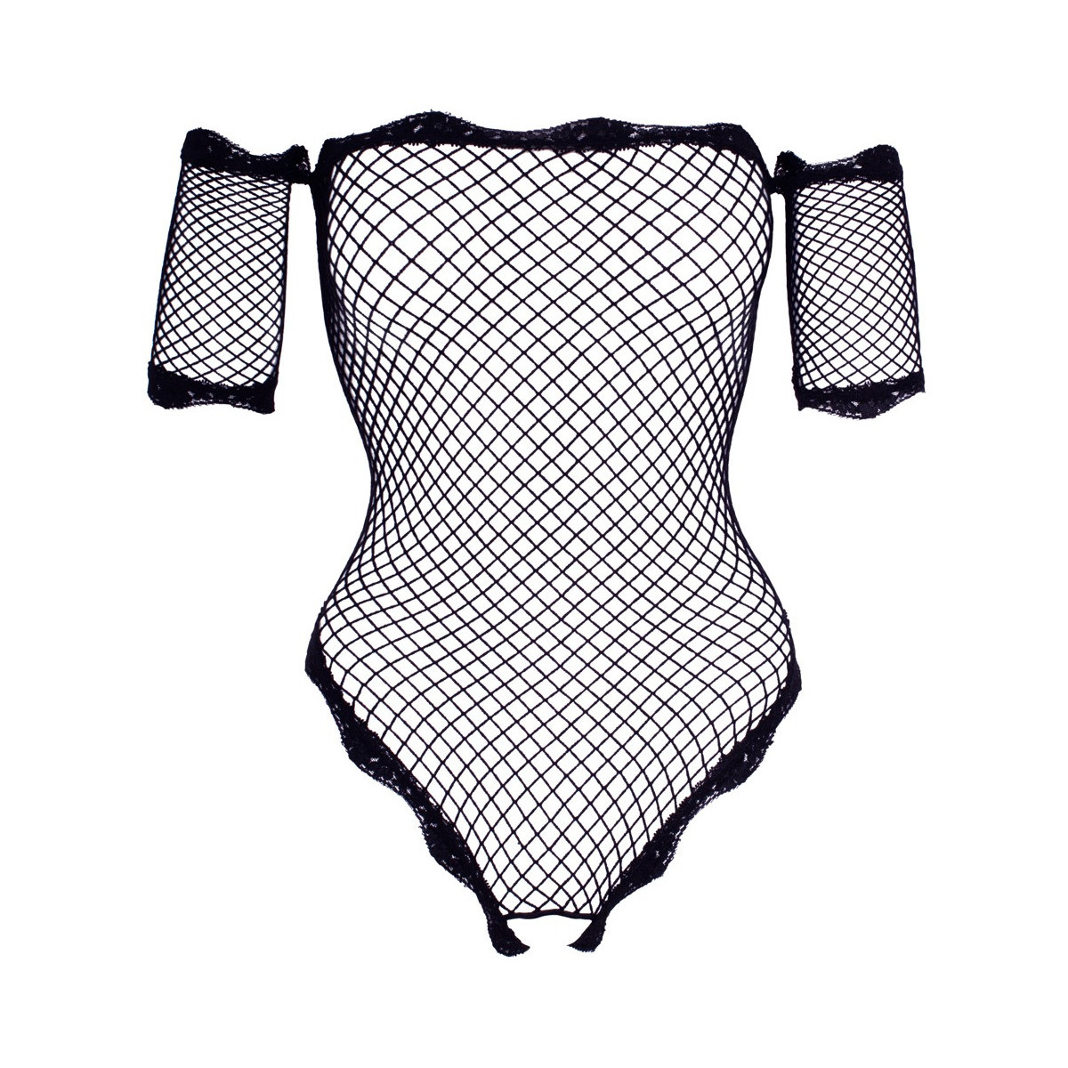 Corpo trasparente ouvert da rete morbida ed elastica, con corta cucitura sul braccio. Con scollatura carmen senza spalle ed eleganti rifiniture in pizzo alla scollatura e sulle braccia e sulle gambe.