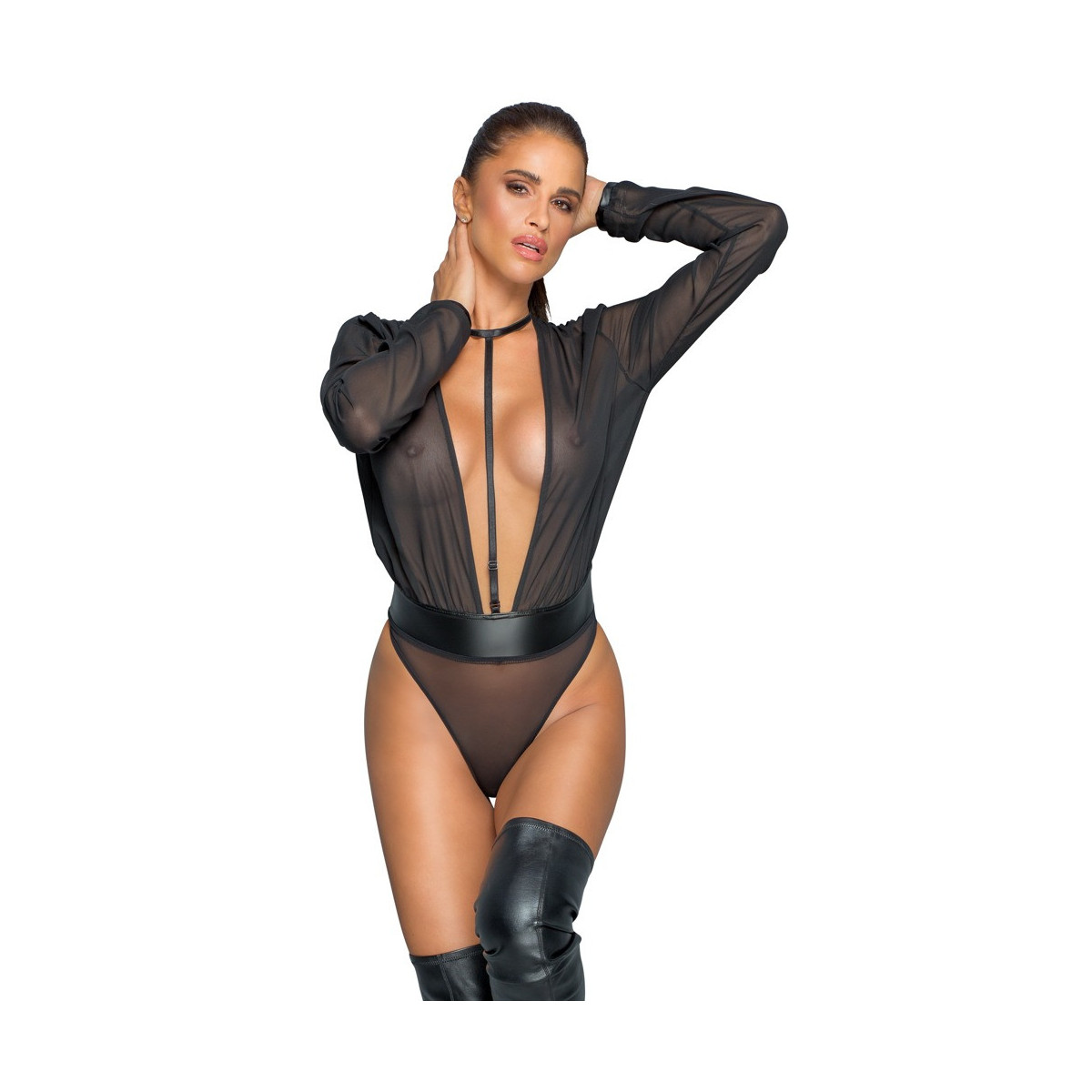 Corpo trasparente a maniche lunghe con camicetta in chiffon e parte superiore in chiffon e mutandina in maglia fine. Scollo extra profondo con ponte regolabile al collo con chiusura a clip. Vita e polsini in Powerwetlook. Mutandine con chiusura a gancio inguinale.
