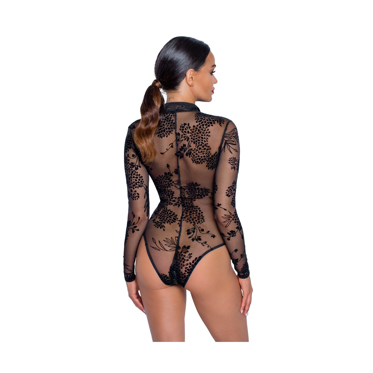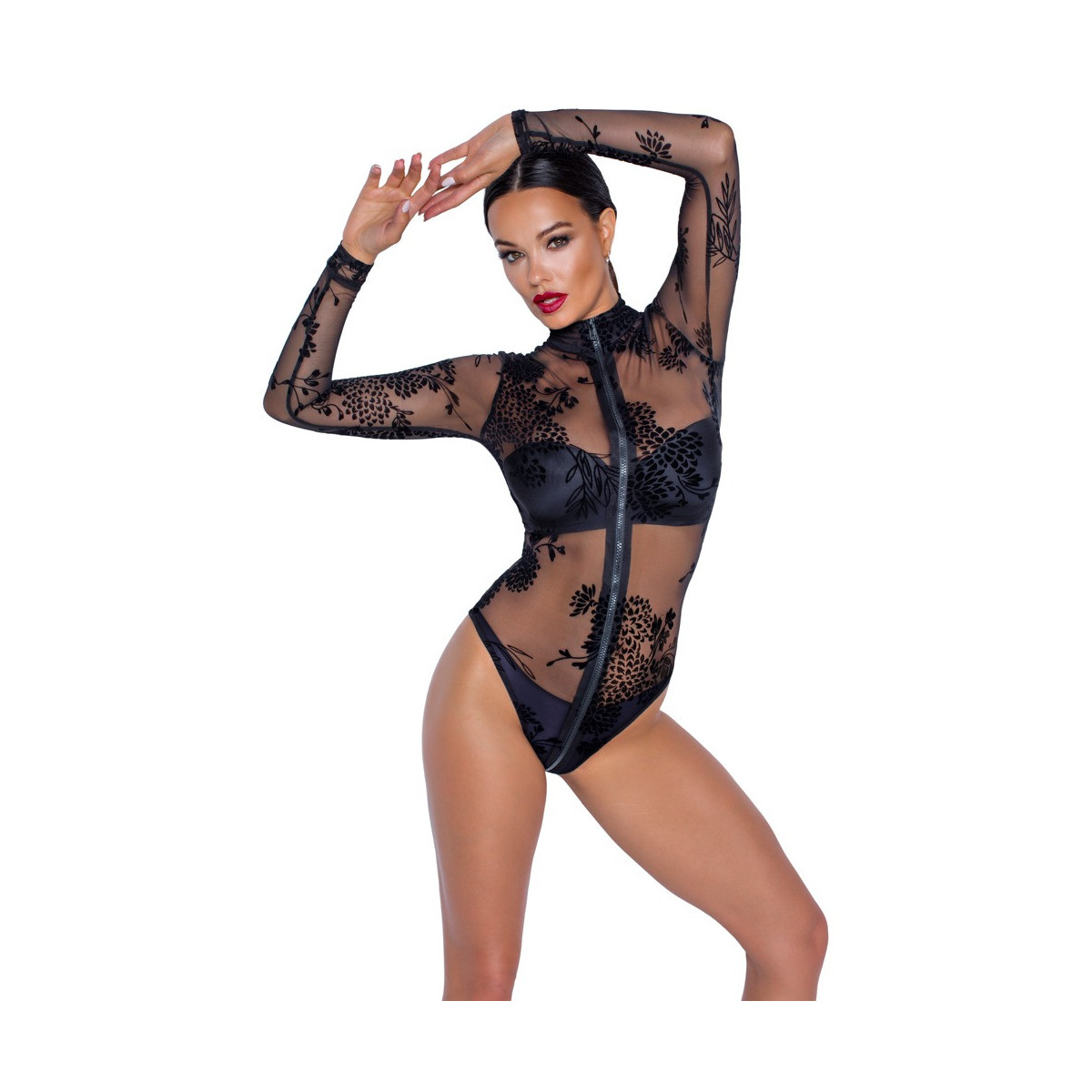 Body a maniche lunghe di Noir completamente realizzato in powernet elastico con stampa flock di velluto fine in disegno floreale. La cerniera a 3 vie, pratica ed erotica, va dal colletto rialzato fino al cavallo.