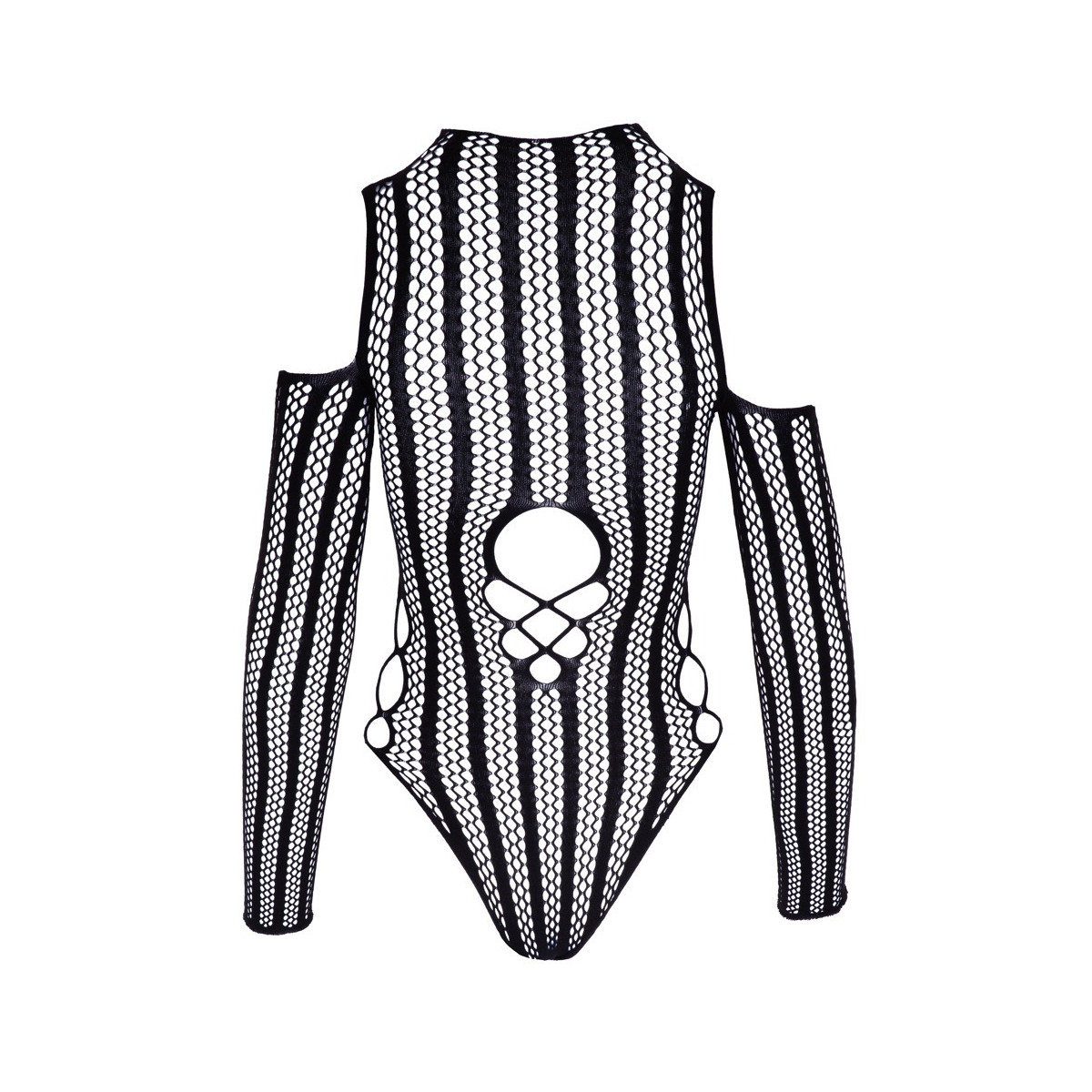 Body a maniche lunghe morbido e coccoloso di NO:XQSE in un'eccitante struttura a rete con strisce intrecciate. Maglia circolare senza cuciture e altamente elastica per un comfort estremamente piacevole da indossare. Eccitantemente off-the-shoulder, con cut-out e maglia grossa sulla scollatura e sulla schiena. Maglia grossolana ai lati. Con bottoni a pressione erotici e pratici sul cavallo.