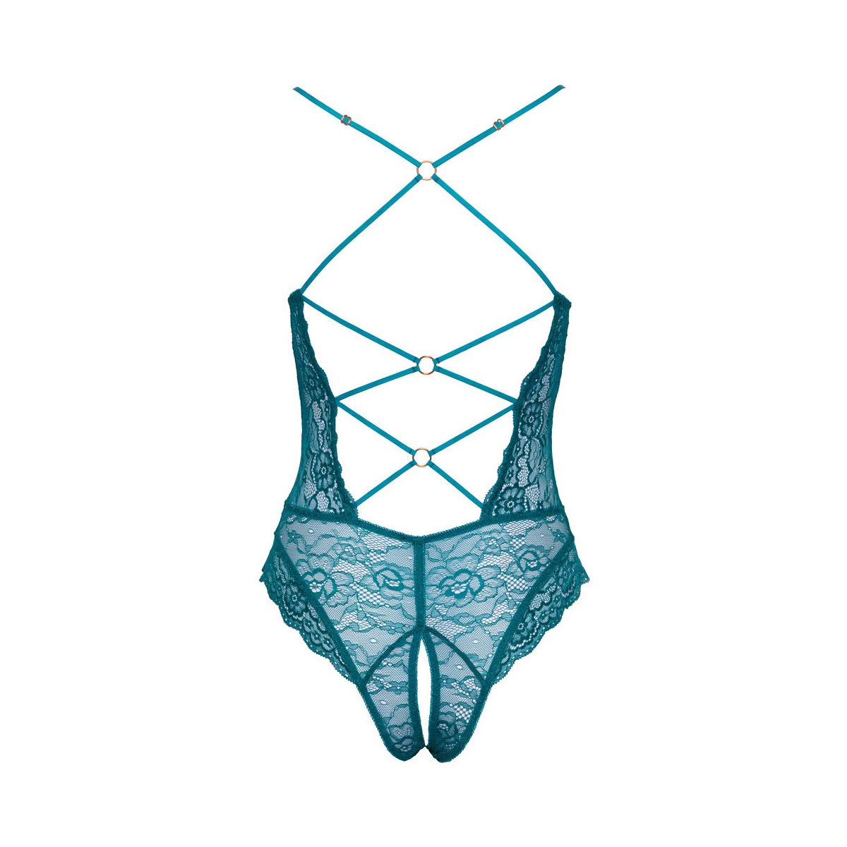 Corpo Ouvert di Cottelli LINGERIE completamente realizzato in fine e morbido pizzo color petrolio. Tagli extra bassi e generosi davanti e dietro - anelli e fasce elastiche color oro rosa tengono tutto insieme in modo bello e altamente decorativo. Il cavallo è già aperto in modo invitante. Le cinghie sono regolabili per una vestibilità perfetta.