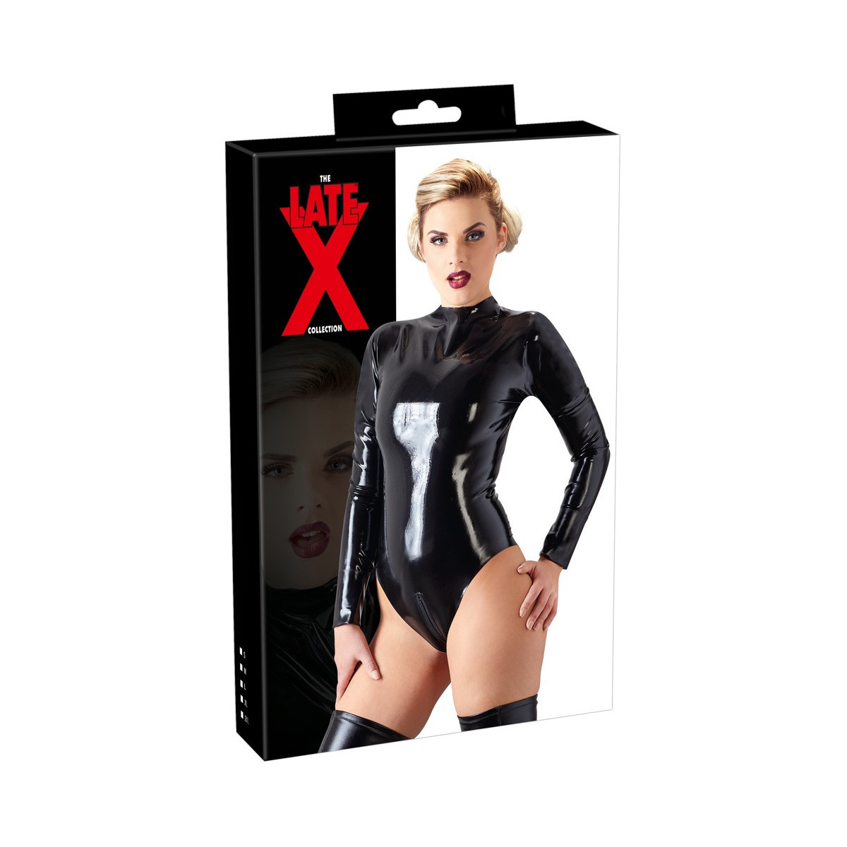 Corpo a manica lunga nero pece e molto lucido. Compresa la cerniera, che può essere indossata sia davanti che dietro. Una seconda cerniera si trova anche nel cavallo. Mette perfettamente in scena le curve femminili!