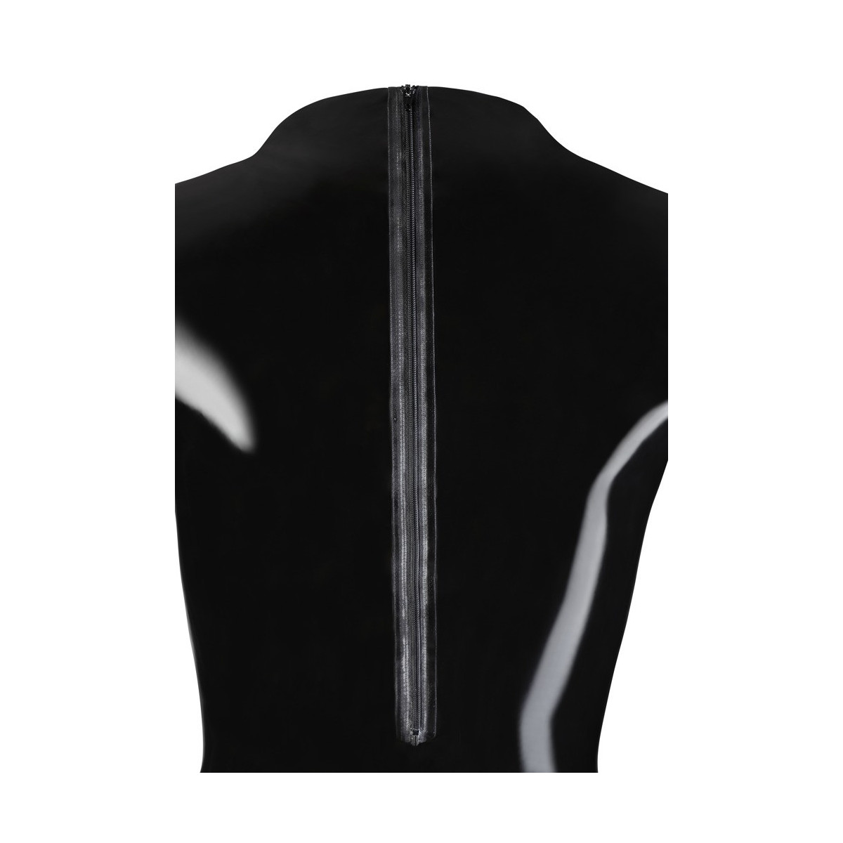 Corpo a manica lunga nero pece e molto lucido. Compresa la cerniera, che può essere indossata sia davanti che dietro. Una seconda cerniera si trova anche nel cavallo. Mette perfettamente in scena le curve femminili!