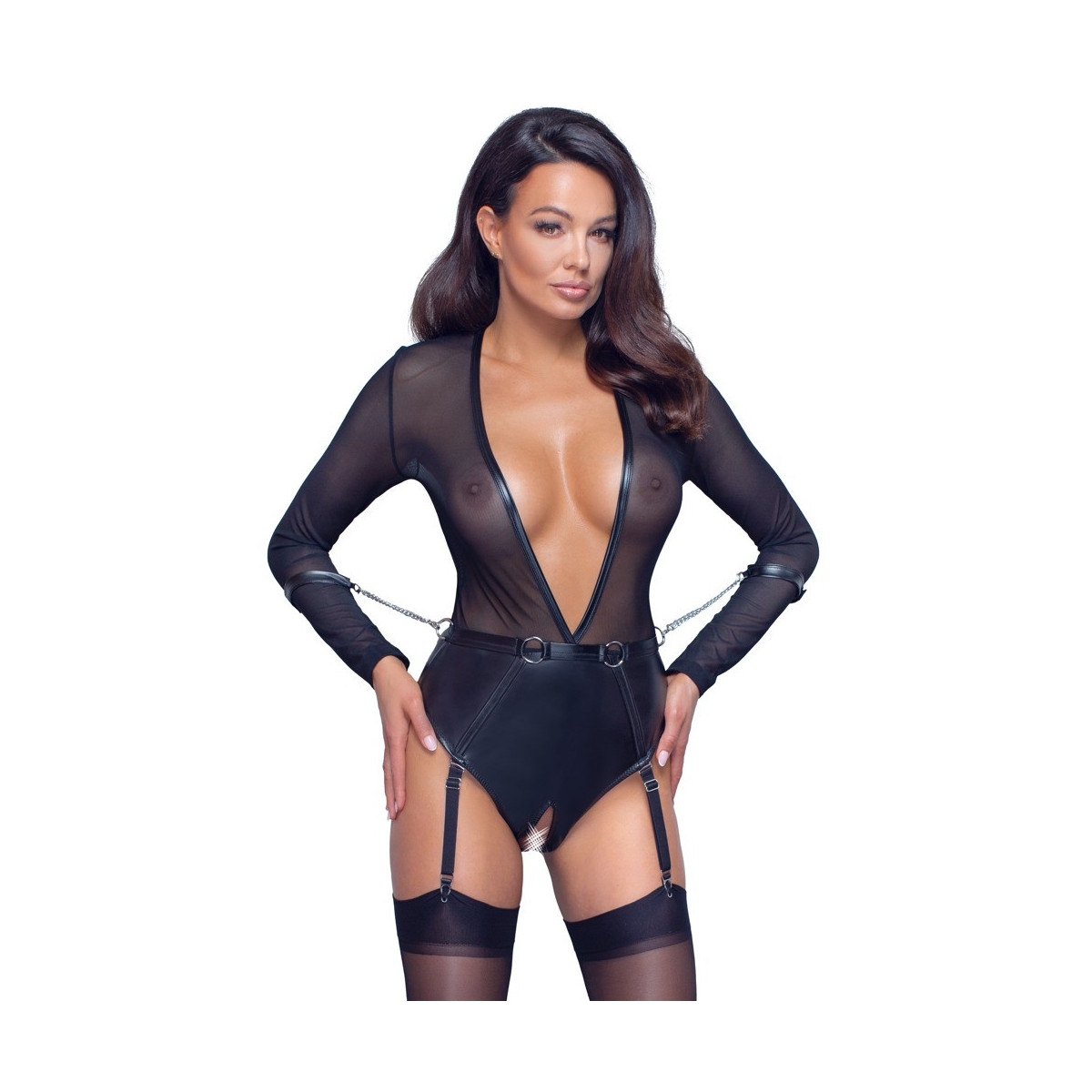 Body reggicalze extra scollato di Cottelli BONDAGE con top trasparente a maniche lunghe in powernet e parte di mutandine completamente inguinale in look opaco di tendenza - ideale outfit da sesso spontaneo! Cintura saldamente cucita con 2 anelli sul davanti e un anello su ogni lato per fissare le manette in dotazione con catene a moschettone. Manette con chiusure in velcro regolabili. Le bretelle regolabili sono rimovibili.