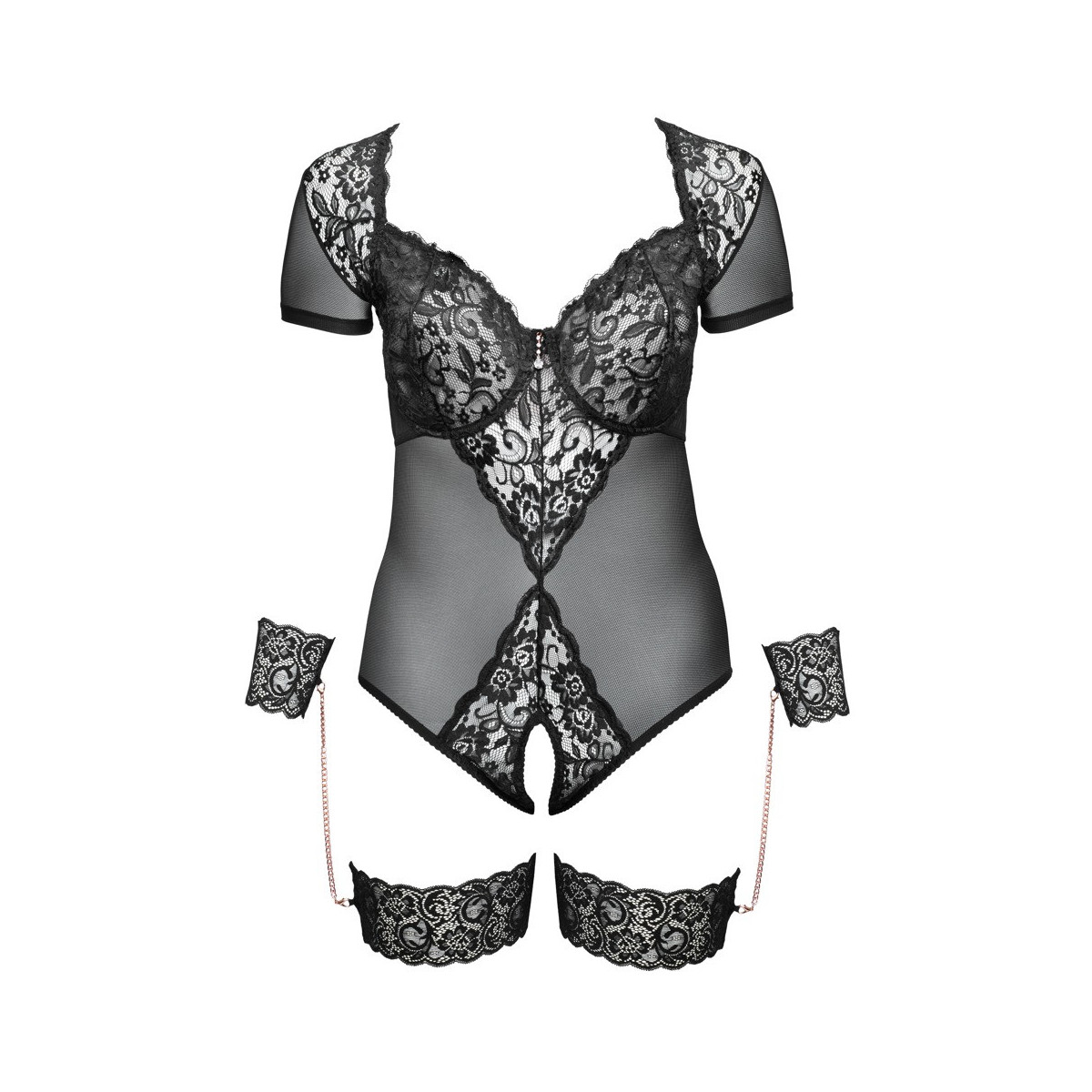 Ouvert body di Cottelli BONDAGE in powernet elastico con inserti in pizzo fine. Con mezze maniche e decorazione di strass tra le coppe con ferretto. Chiusura a gancio sul retro. Mutandine aperte sul cavallo, con pizzo sul davanti, completamente in powernet sul retro. Sono inclusi i polsini per le cosce e le mani in pizzo, che sono collegati da catene a moschettone staccabili color oro rosa.
