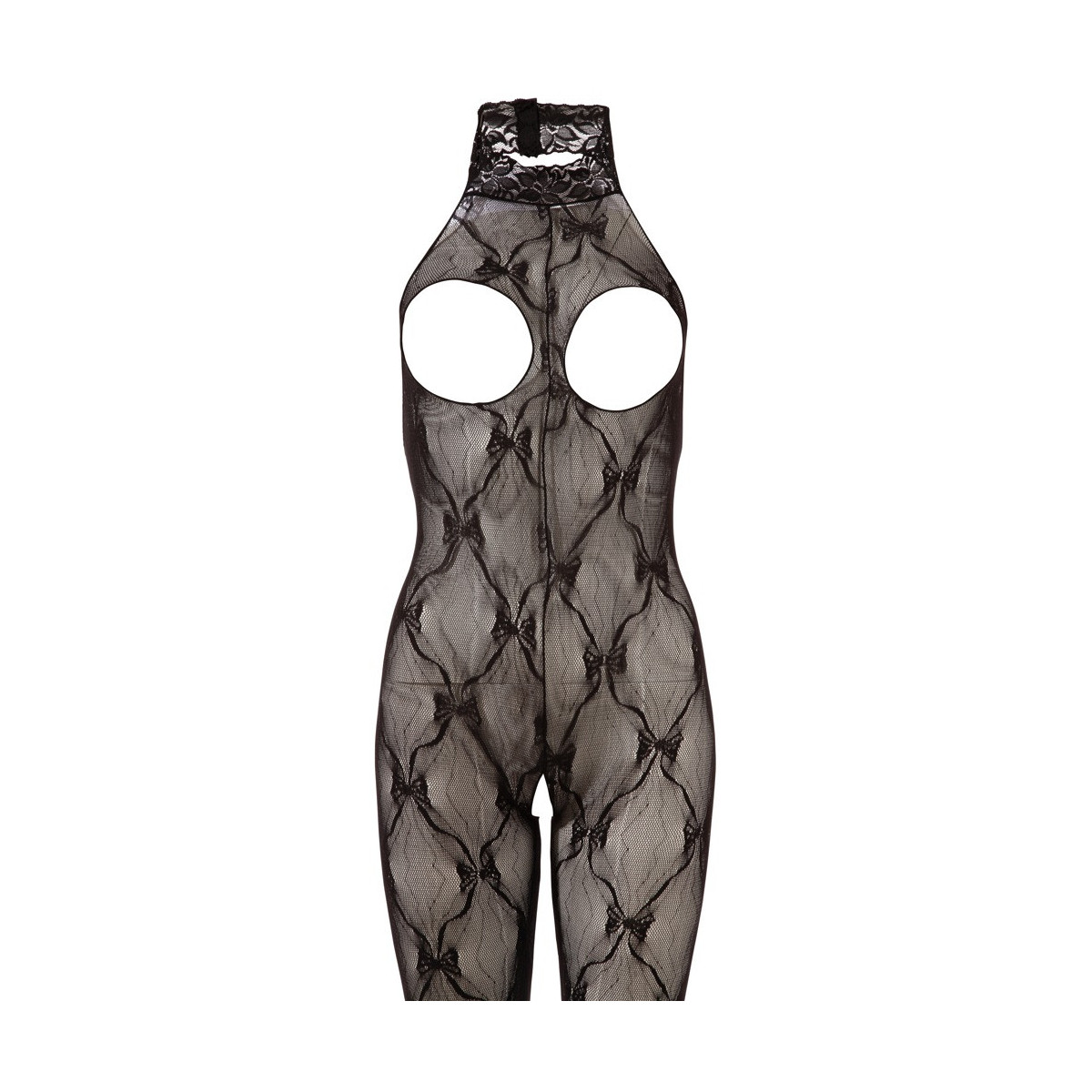 Catsuit dal seno scoperto in pizzo d‘effetto, con allacciatura dietro al collo, apribile con chiusura a velcro. Apertura all‘inguine. Con piede. Nero. 100% poliammide.