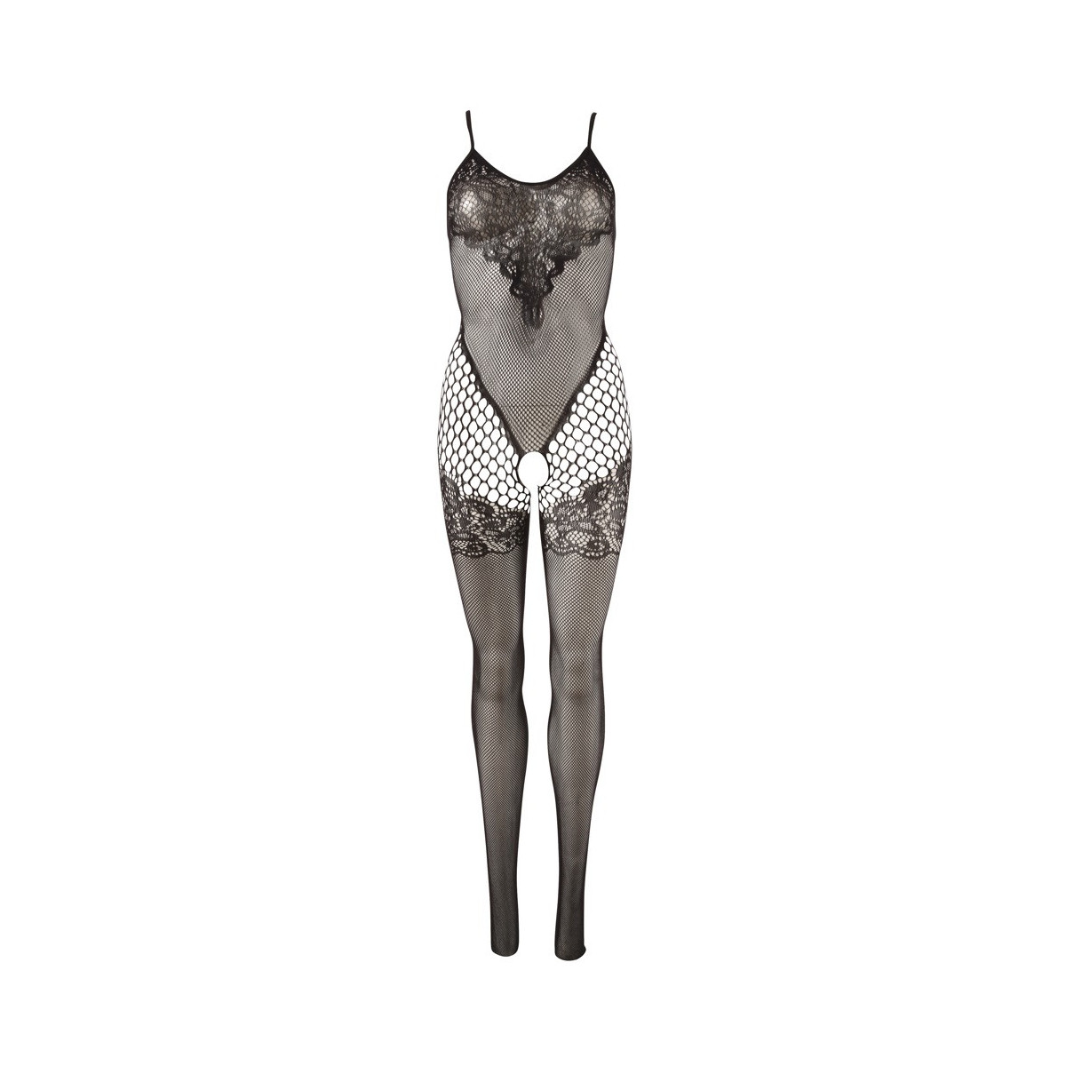Catsuit nera con ottica in pizzo sul petto e sulle cosce e cavallo aperto. Senza soluzione di continuità. Cinghie elastiche. Con piede. 90% poliammide, 10% elastan.