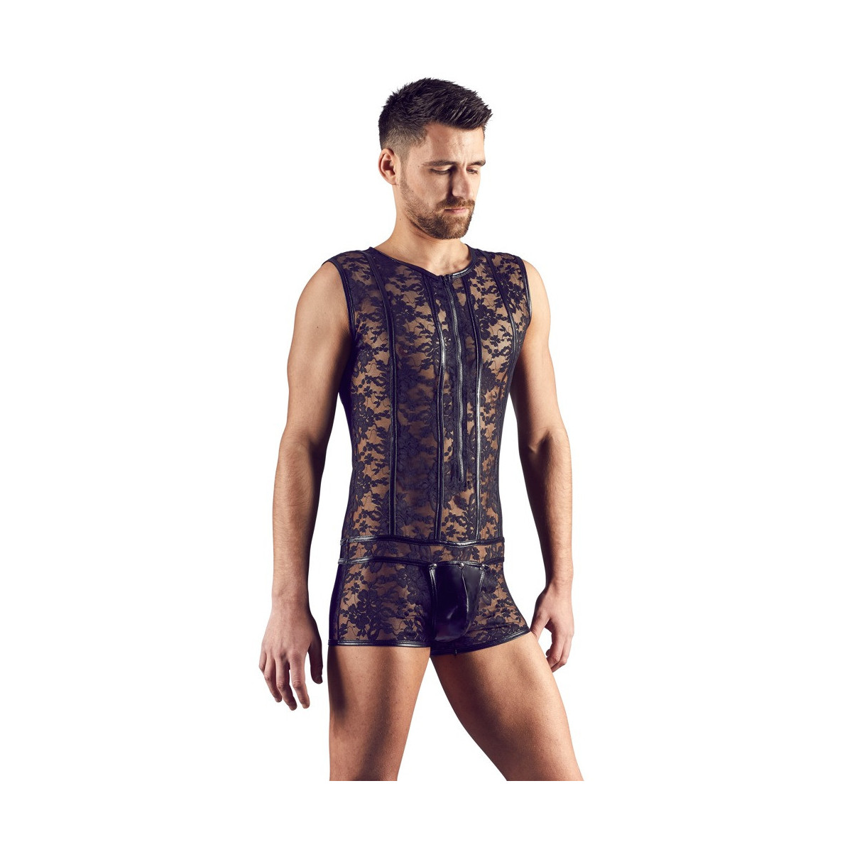 Questo body con zip frontale convince in un'eccitante combinazione di elastico, pizzo a fiori e strette strisce wetlook. Con l'aiuto dell'impressionante funzione di rigonfiamento, fa apparire il cavallo eccitante e voluminoso, spingendo il pene e i testicoli facilmente attraverso il foro elastico interno nel sacchetto... Il marsupio si sbottona.