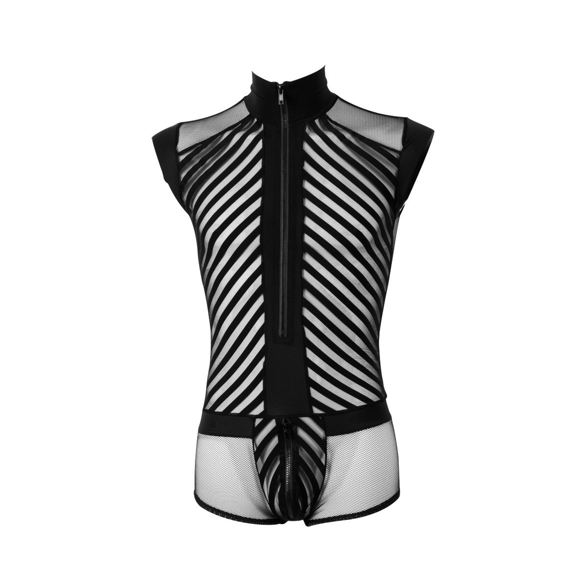 Questo corpo corto con maniche corte ti mette in scena in modo sofisticato! Il mix di materiali di due tipi di maglia e il look a strisce alla moda danno allo spettatore delle intuizioni eccitanti. Cerniera sul davanti e sotto il marsupio.