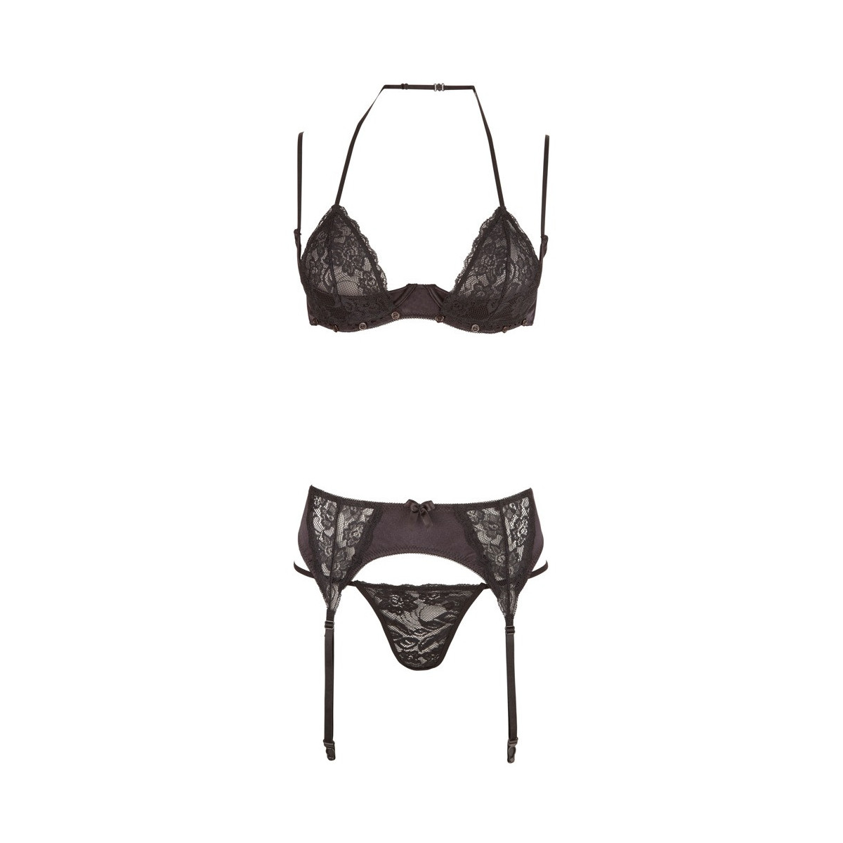 Questo set di reggicalze in 3 pezzi affascina con un delicato pizzo a fiori. Con il sensuale reggiseno con ferretto le coppe possono essere sbottonate per creare un leggero lifting. Il set comprende anche un reggicalze con bretelle regolabili e un perizoma sexy.
