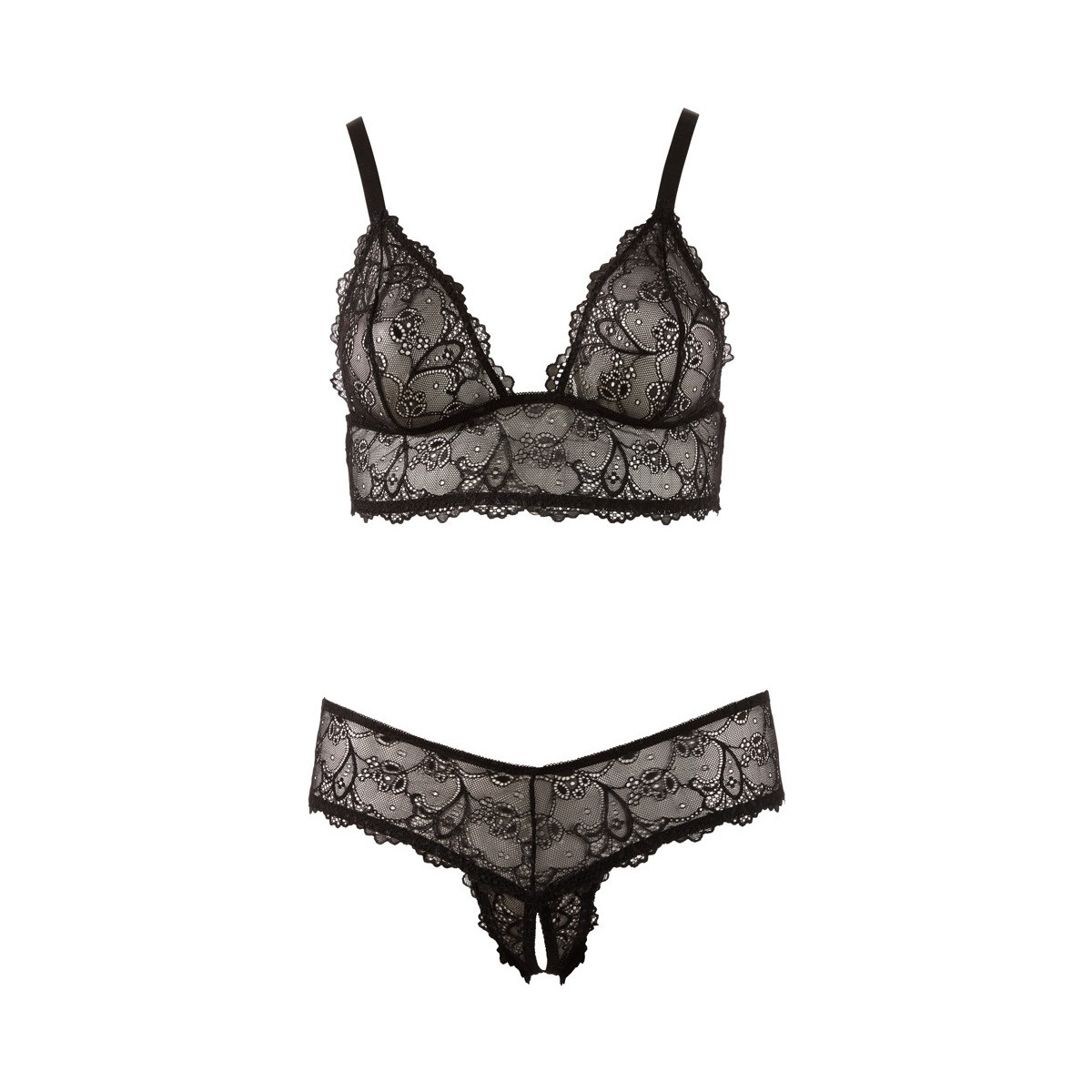 Pizzo nero filigranato: reggiseno delicato e morbido senza chiusura e con spalline regolabili più raffinato perizoma con cavallo aperto per ore di passione per due.