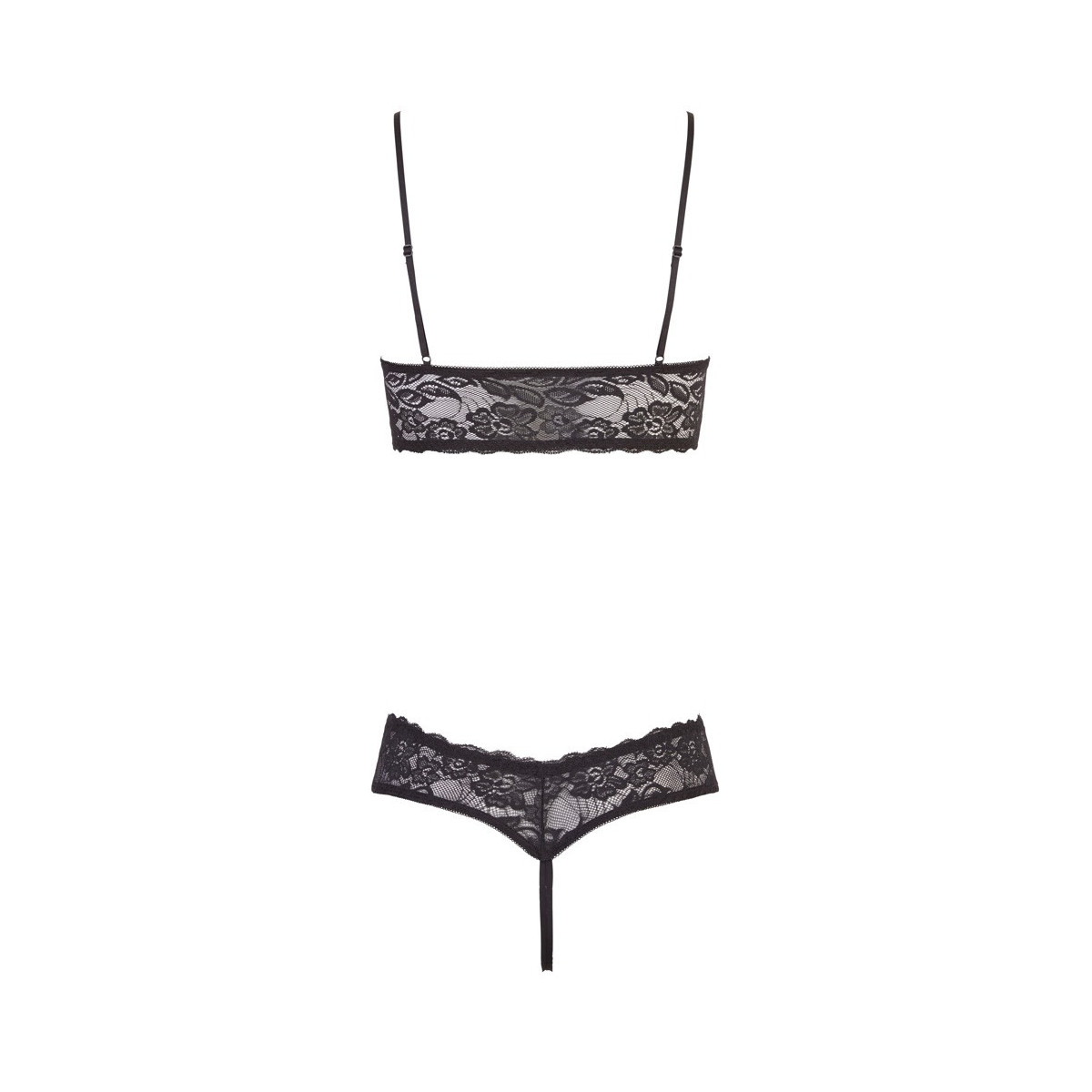 Dolce ensemble composto da reggiseno morbido e perizoma abbinato. Il reggiseno ha un'ampia fascia sottoseno in nobile pizzo nero e coppe in raso rosso. Le spalline sono regolabili e un piccolo cuore di strass tra le coppe attira tutti gli occhi su di te. Il perizoma abbinato è anche fatto di pizzo nero e raso rosso ed è seducentemente aperto sul cavallo.