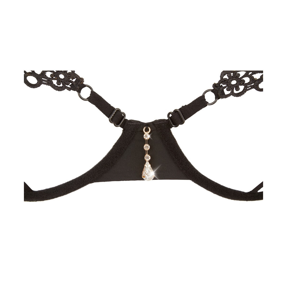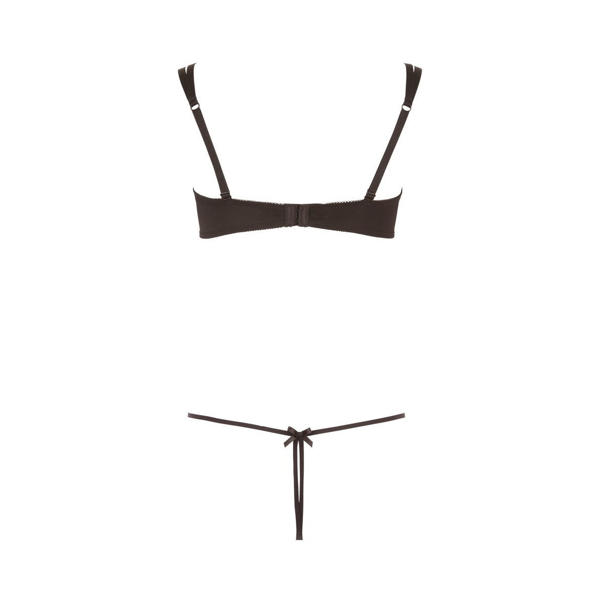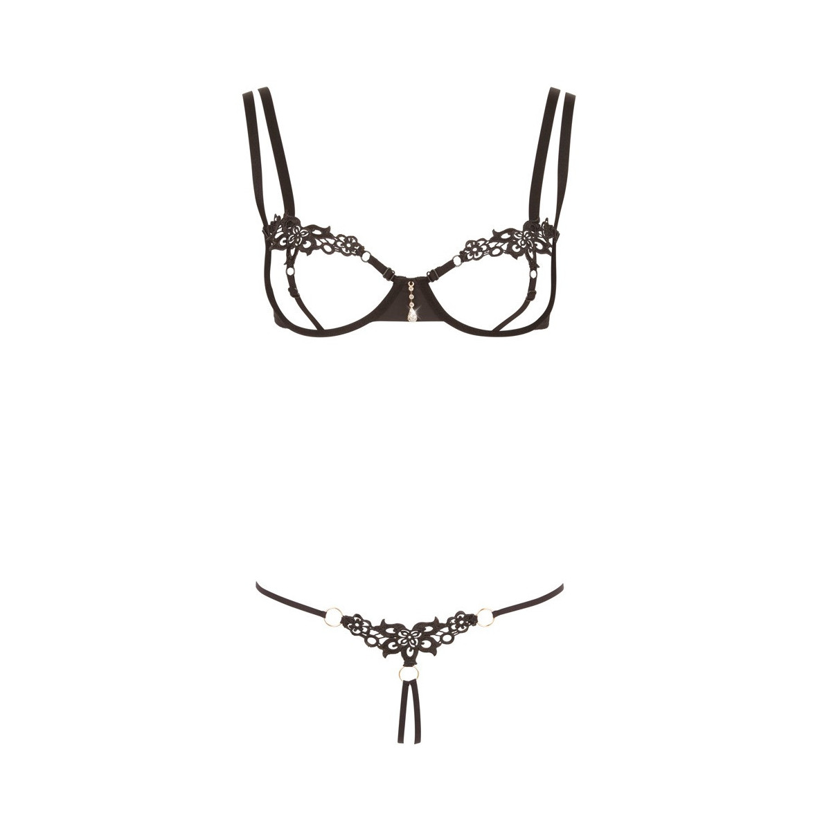 Il reggiseno con le coppe aperte è composto solo da ferretti e nastri e quindi lascia guardare in profondità, perché i capezzoli sono coperti solo dal ricamo. Nella parte posteriore, il reggiseno ha una chiusura a gancio e le spalline sono regolabili in lunghezza. Il perizoma abbinato è invitante senza cavallo e ha anche un nobile ricamo sul davanti, che è collegato ai nastri tramite tre piccoli anelli color argento.