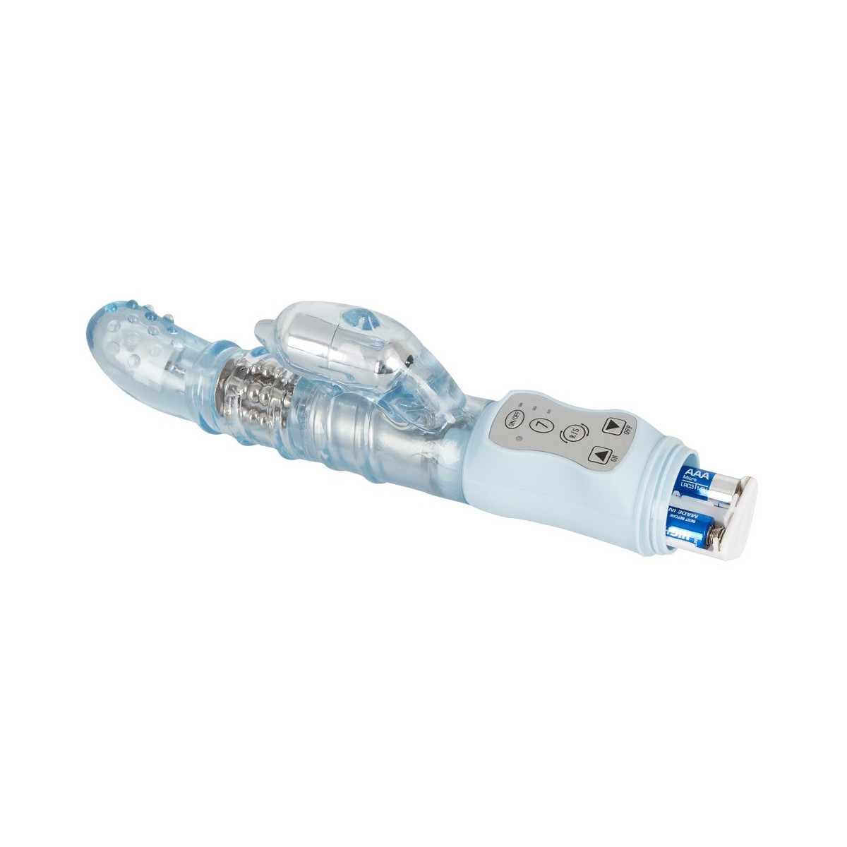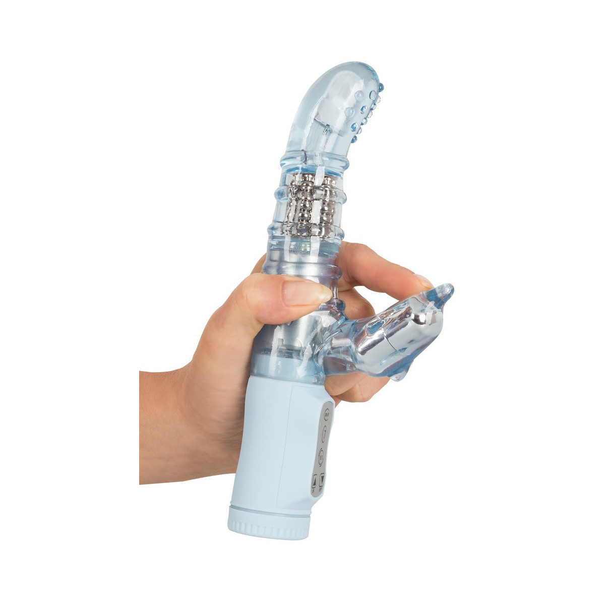 Danny è un tipo inquieto che non da tregua fino a quando non crollate completamente soddisfatte!Con punta rotante a rilievi, sfere metalliche che girano nel gambo e stimolatore del clitoride vibrante. Vibrazione a sette livelli, rotazione destra/sinistra rispettivamente a 3 livelli con pulsante. Ca. 21 cm di lunghezza, Ø 3 cm. Azzurro/trasparente. Materiale: TPE, ABS.
