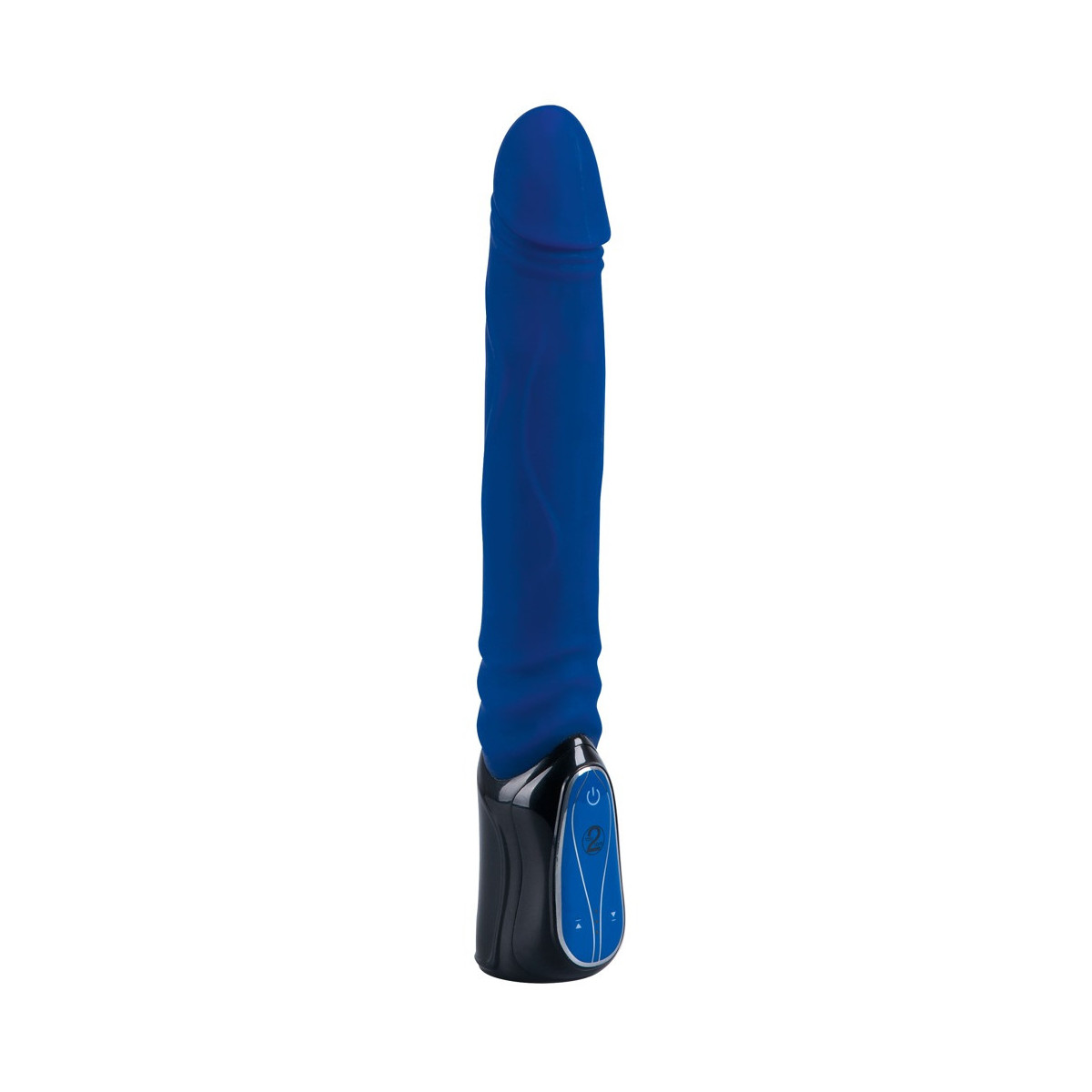 Vibratore con struttura di stimolo distintiva, glande paffuto e tre velocità d'impatto che possono essere controllate dalla pressione della testa. Blu. Lunghezza totale 30 cm, profondità di inserimento 22 cm, Ø da 3,5 cm a 4 cm. Materiale: silicone, ABS. (Si prega di ordinare le batterie separatamente: 4 x Mignon/AA)