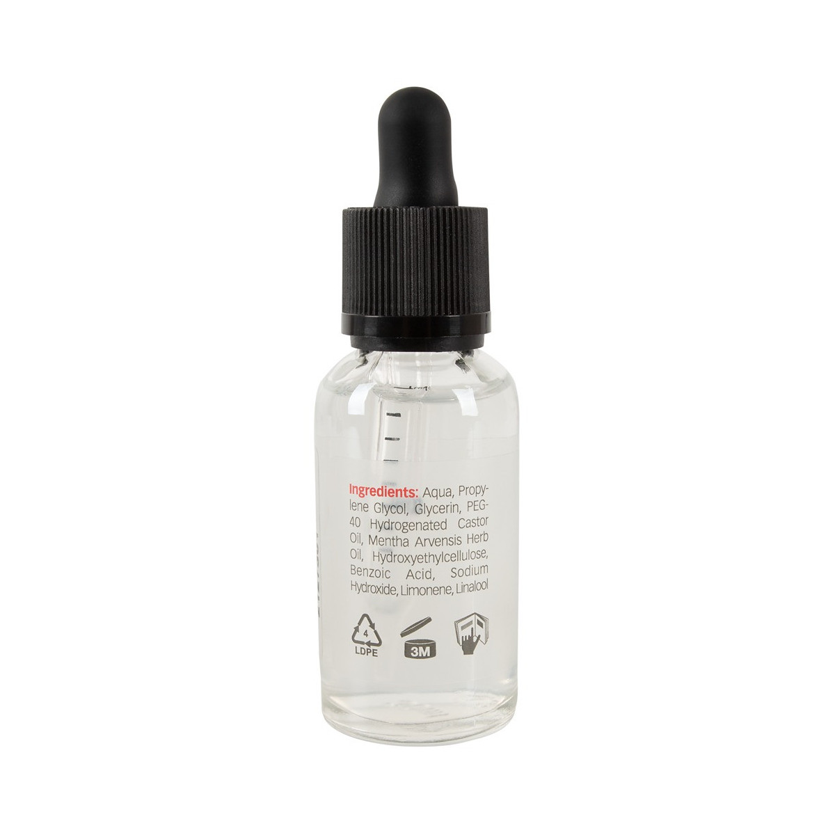 Aqua, Propylene Glycol, Glycerin, PEG-40 Hydrogenated Castor Oil, Mentha Arvensis Herb Oil, Hydroxyethylcellulose, Benzoic Acid, Sodium Hydroxide, Limonene, Linalool