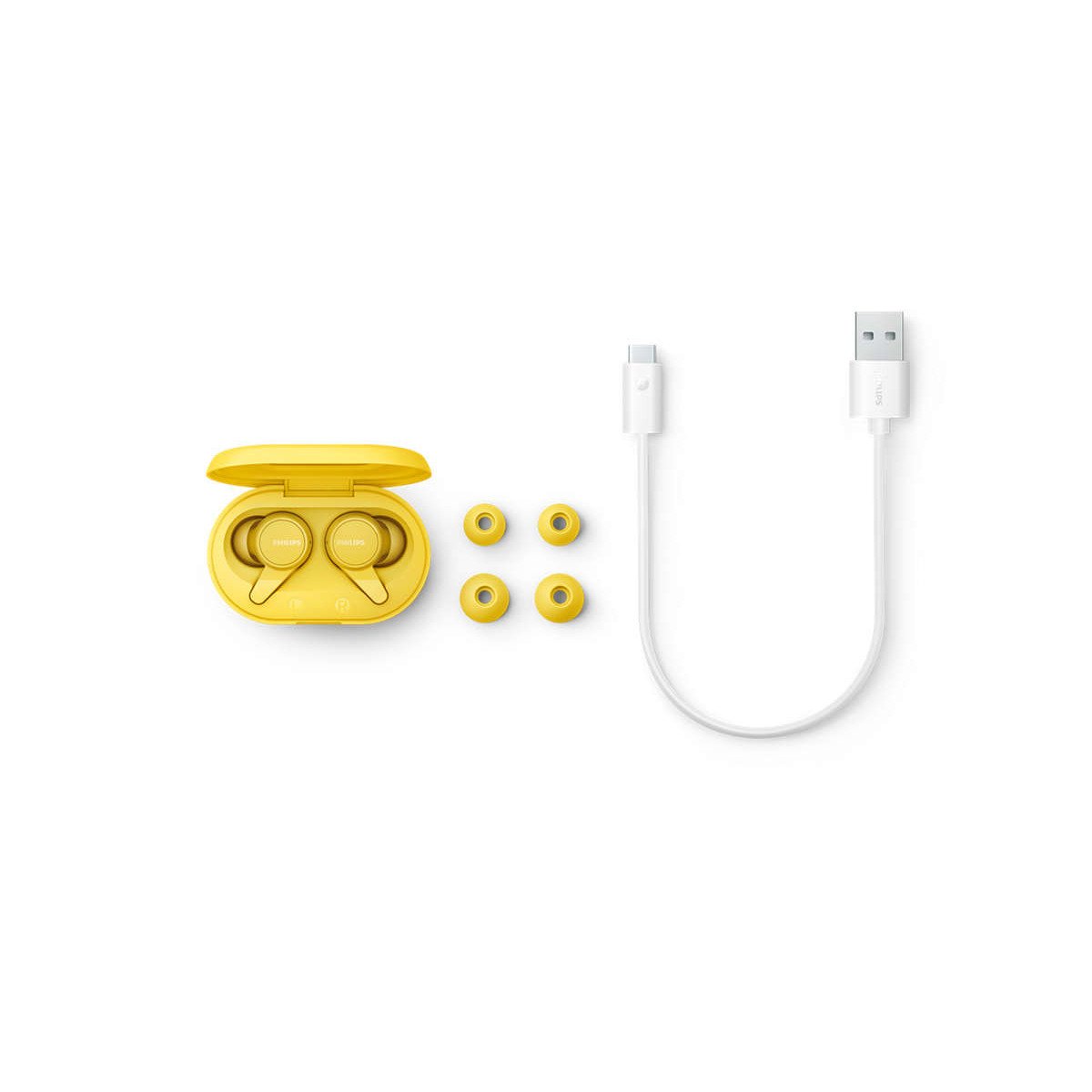 Portale dove vuoi, connettiti e vai! Queste fantastiche cuffie True Wireless sono dotate di una custodia di ricarica estremamente compatta che può essere riposta in tasca, per offrirti un audio affidabile e la massima praticità, ovunque ti trovi. Resistenza agli schizzi e al sudore IPX4, e fino a 18 ore di riproduzione!