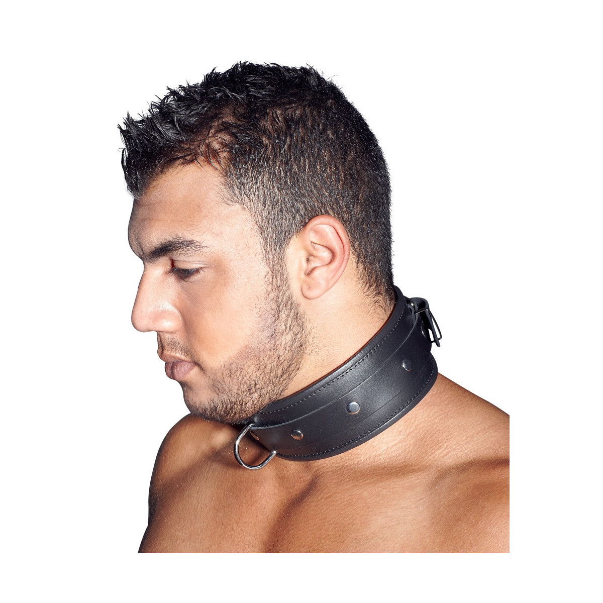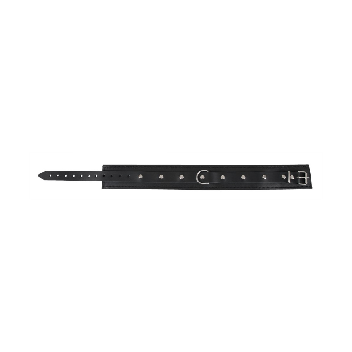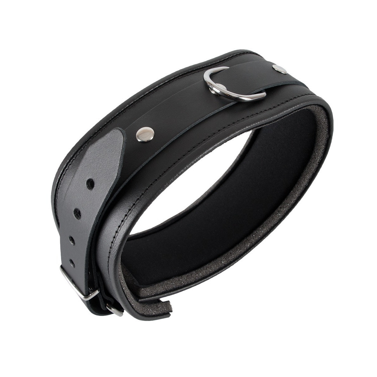 Polsino da collo imbottito con bordi bordati. Davanti con anello a D. Nero. Regolabile con chiusura a fibbia. Materiale: pelle crosta, metallo.