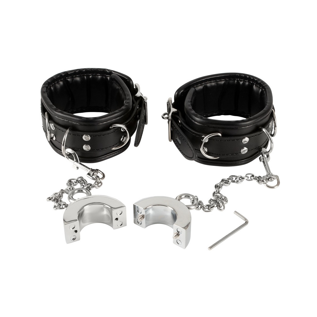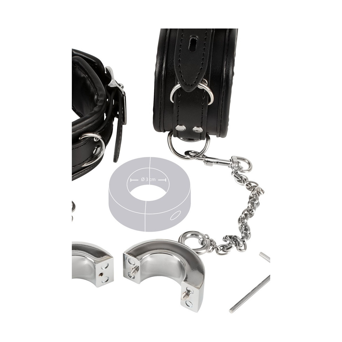 Hand Cuffs & Cock Ring by fetish collection: Manette a mano più anello per il pene in acciaio inossidabile con due catene a moschettone corte e saldamente bloccate da agganciare alle manette. Le morbide manette imbottite in un elegante look in pelle sono regolabili in circonferenza da 17 cm a 29 cm con chiusure a fibbia. L'anello del pene in acciaio inossidabile si apre e si chiude con una chiave a brugola (inclusa).