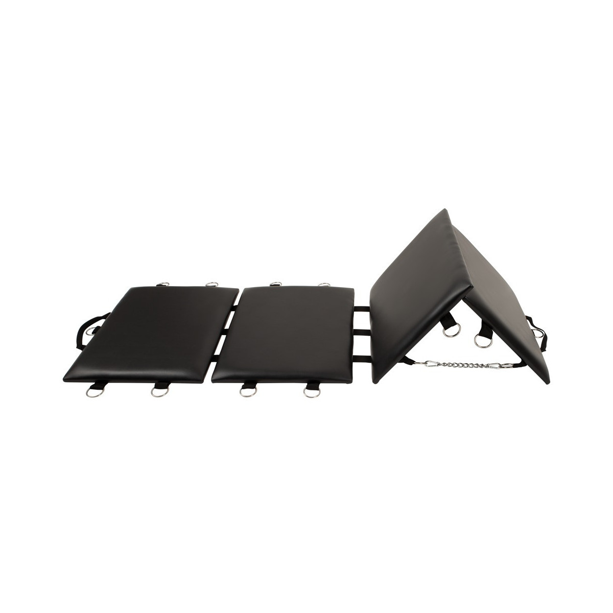 Tavola bondage 2.0 di You2Toys, composta da 4 superfici imbottite di seduta/sdraiata (60 x 60 cm) con rivestimento in similpelle di alta qualità e facile da curare, collegate tra loro da 3 cinghie stabili antistrappo. Questo rende la tavola molto flessibile, così che sono possibili diverse posizioni di bondage e la tavola può essere comodamente ripiegata dopo il gioco e facilmente trasportata o riposta.