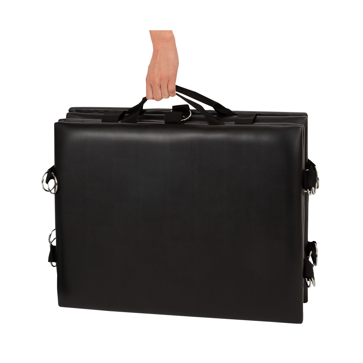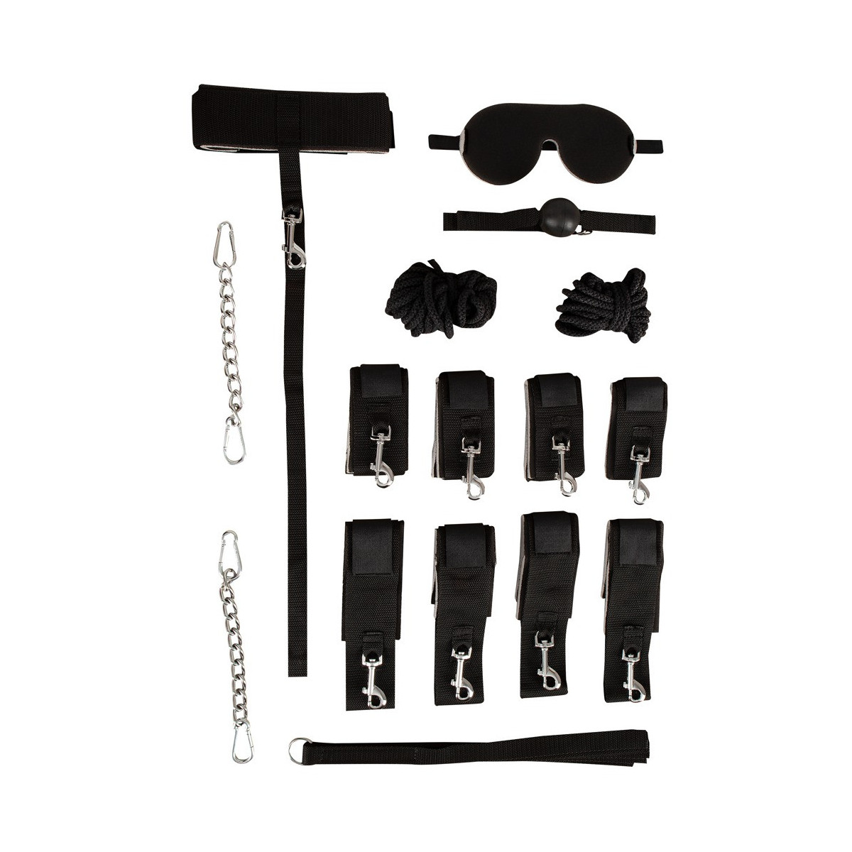 La tavola da bondage a montaggio rapido ha 8 anelli su ogni lato e 1 anello ciascuno all'estremità della testa e dei piedi (anello Ø 4,5 cm ciascuno), in cui le cinghie incluse sono rapidamente agganciate individualmente con i loro moschettoni.