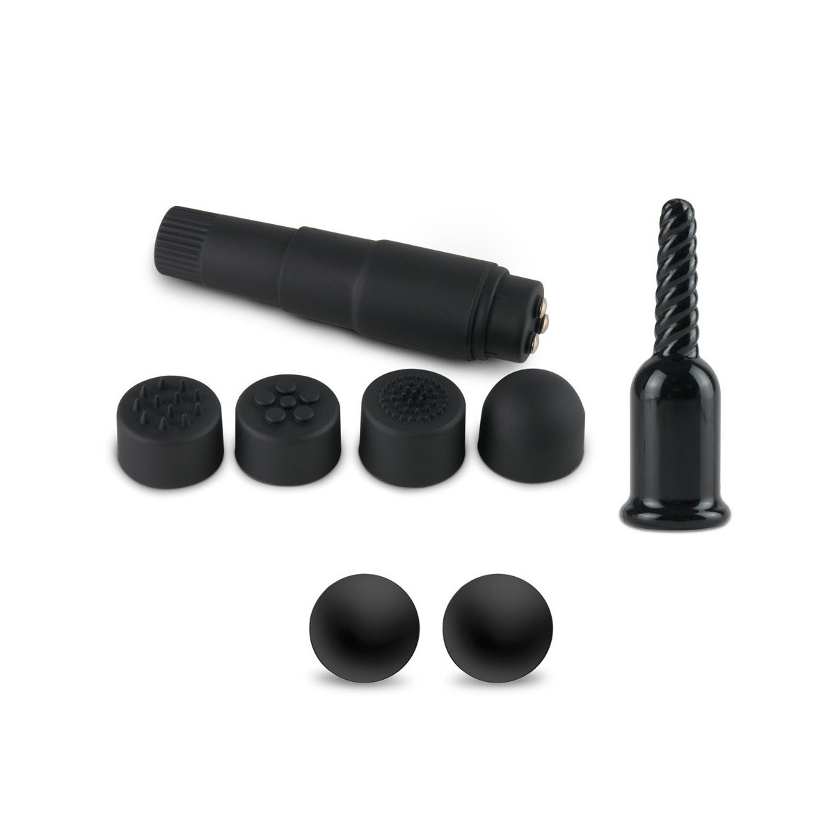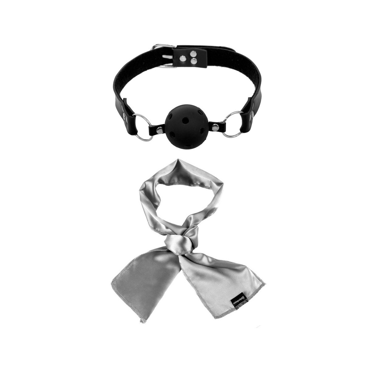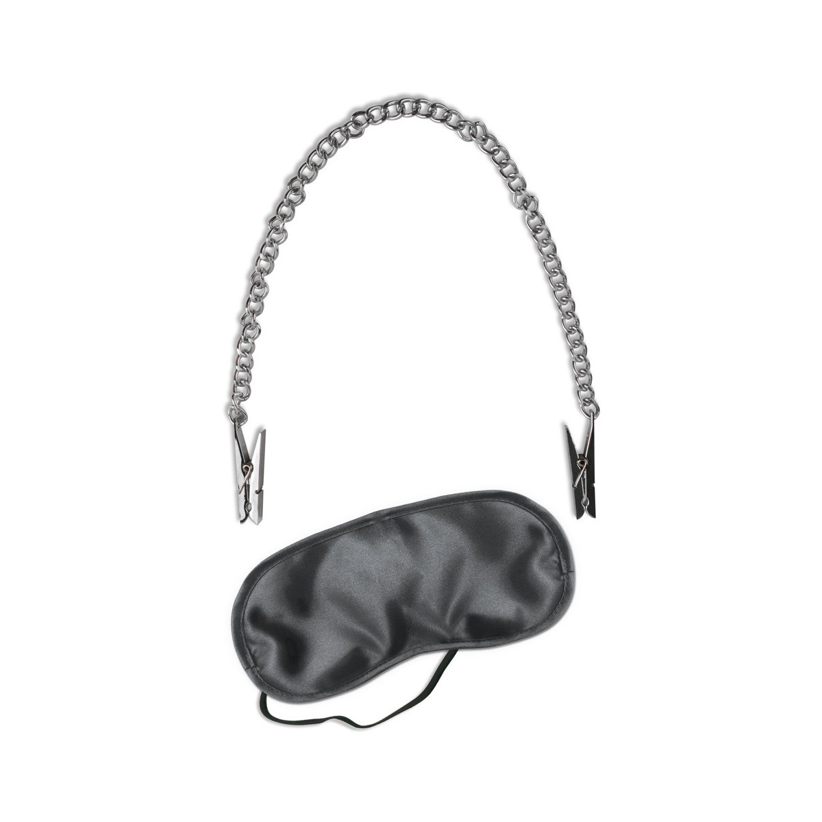 Set di 10 pezzi bondage/toy - contenuto: gag, plug anale, mini-vibratore (con 4 attacchi), maschera per gli occhi, manette, morsetti per capezzoli, asta a molla, mini-frusta, benda di raso e palline dell'amore.